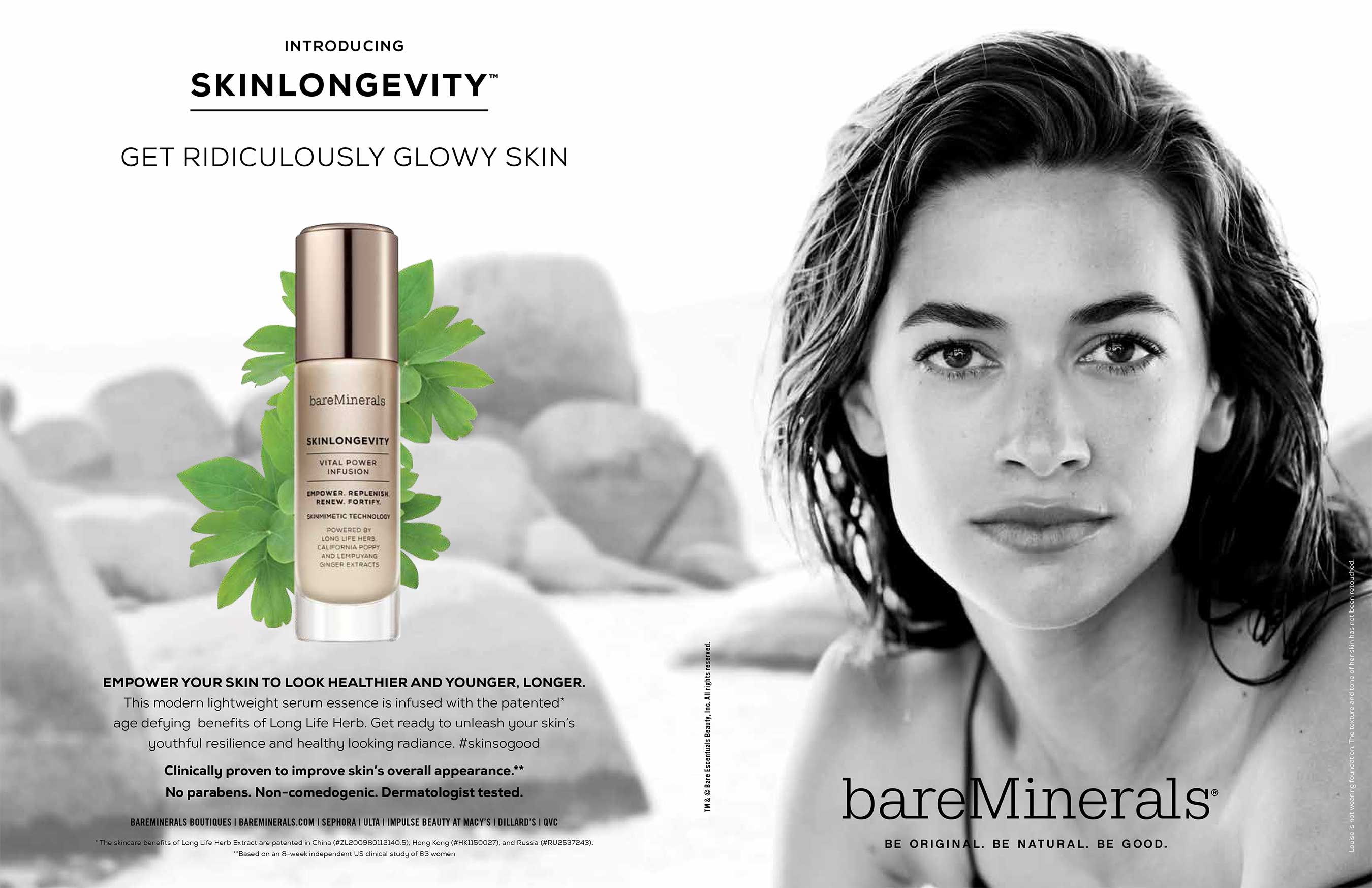 bareMinerals® unleashes ridiculously glowy skin this January with the launch of their new SKINSORIALS™ Skincare line and hero product SkinLongevity™ Vital Power Infusion—a first of its kind lightweight serum essence designed to reawaken and help maintain skin’s most vibrant look of health.