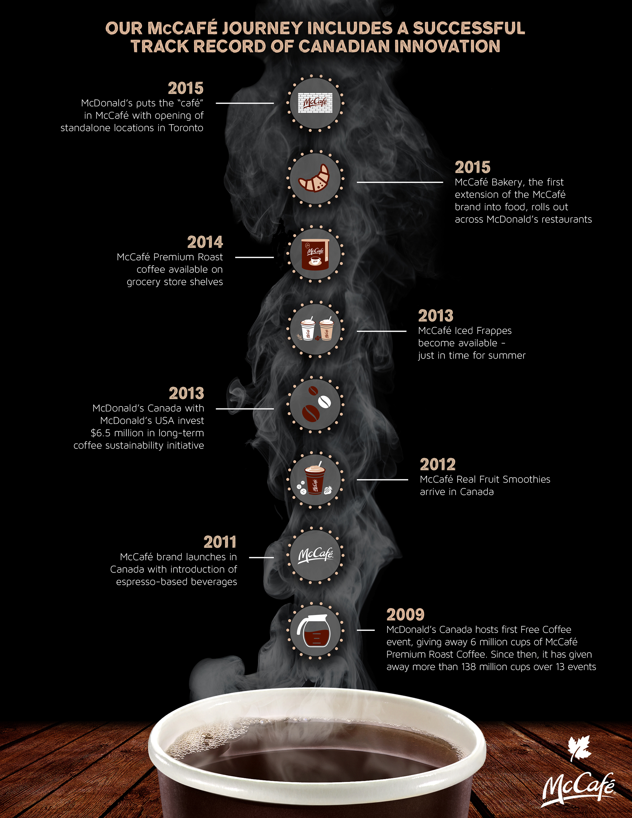 In 2008, McDonald’s Canada started its journey to become recognized for great tasting coffee. Since the launch of its first Free Coffee event in April 2009, the company has given away more than 138 million cups of coffee over 13 events. In 2011, the McCafé brand was officially launched with the introduction of espresso-based beverages which was followed with Real Fruit Smoothies in 2012 and the successful launch of McCafé Premium Roast Coffee through grocery channels in 2014. Today, coffee sales have tripled and the brand has more than doubled its coffee market share, outpacing the growth of the industry overall, reinforcing its position as a dominant player in the Canadian quick-service coffee industry.
