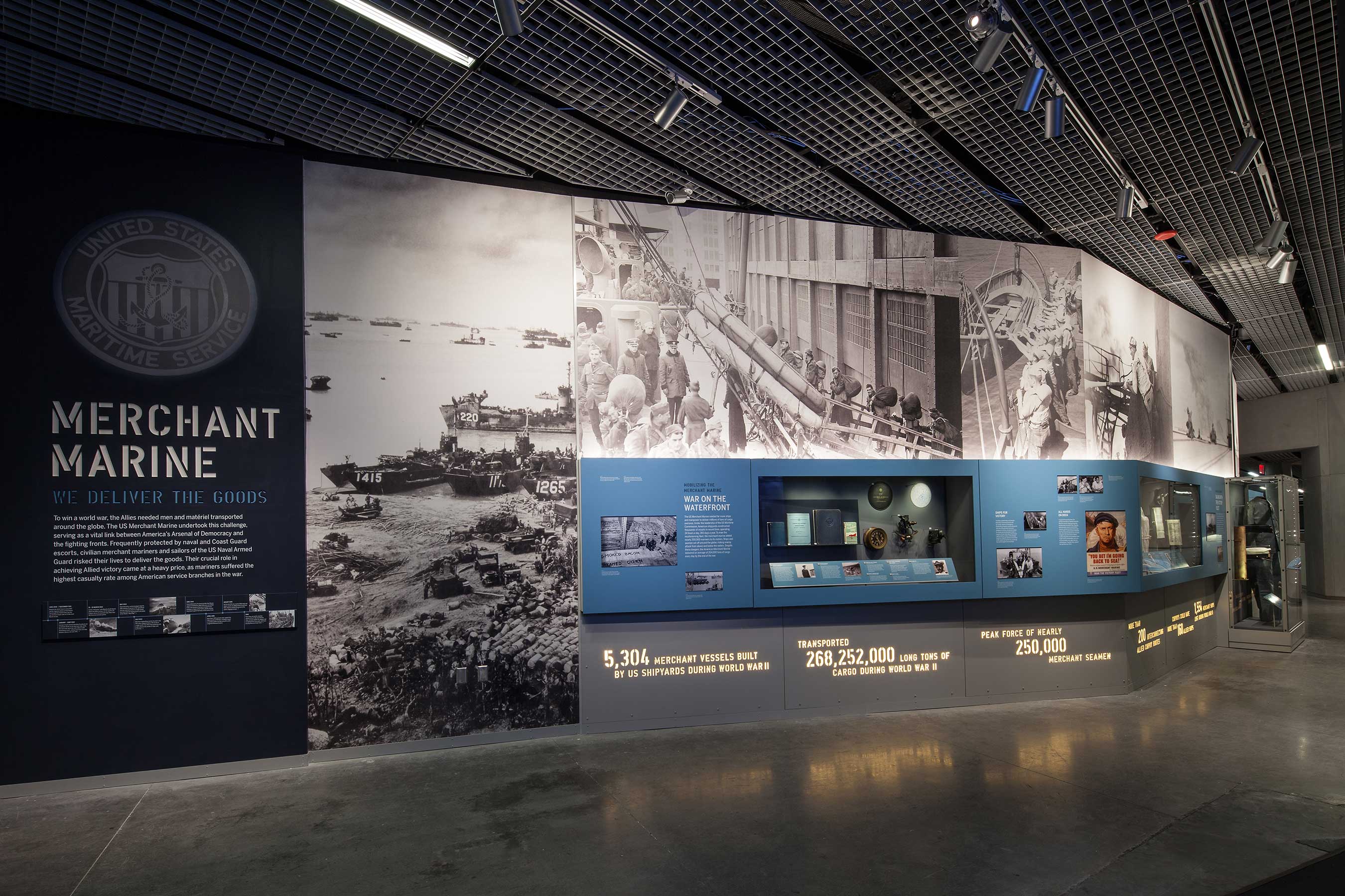 Along with Road to Tokyo, the Museum also opened a new exhibit on the US Merchant Marine. LTJG Ralph E. Crump Merchant Marine Gallery is a stand-alone gallery that honors the mariners who risked their lives transporting weapons, men and matériel to distant warfronts. Features include a video, artifacts, a model of a Liberty ship and an engaging array of personal narratives. The gallery is situated in the Solomon Victory Theater complex, at the end of the American Spirit Bridge – a new glass-and-metal bridge that connects the Museum’s Louisiana Memorial Pavilion with the rest of the six-acre campus for the first time.
