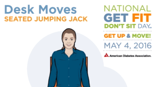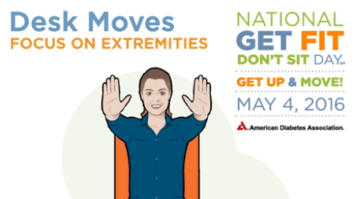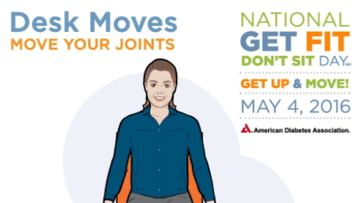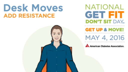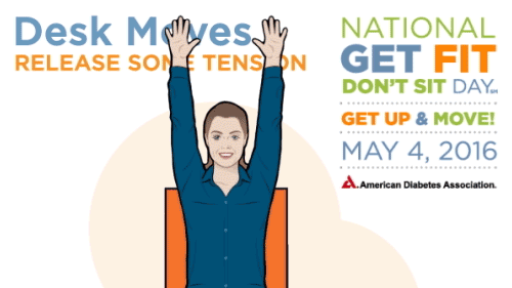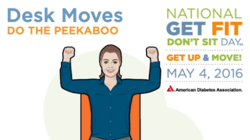 The American Diabetes Association (Association), the nation’s leading voluntary health organization committed to advancing the research, prevention, care and treatment of diabetes, is proud to announce its second annual National Get Fit Don’t Sit Day, May 4, 2016. On this Wellness Day, the Association encourages everyone to get up and get moving at least once every 90 minutes throughout the work day to limit the amount of time they spend sitting down, and to lower their risk of type 2 diabetes and other obesity-related illnesses.