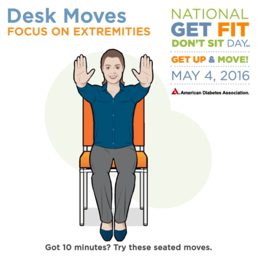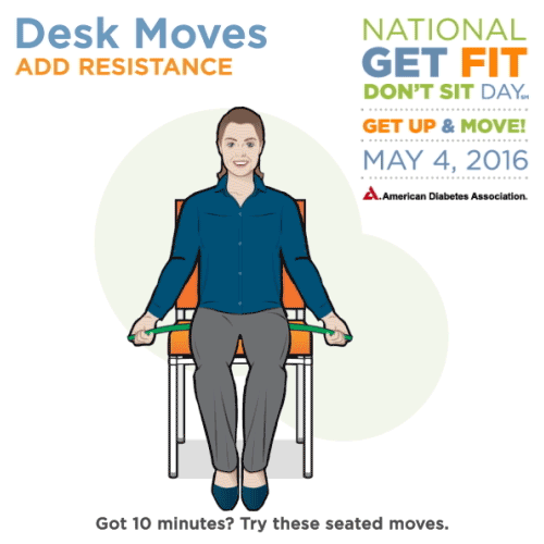 The American Diabetes Association (Association), the nation’s leading voluntary health organization committed to advancing the research, prevention, care and treatment of diabetes, is proud to announce its second annual National Get Fit Don’t Sit Day, May 4, 2016. On this Wellness Day, the Association encourages everyone to get up and get moving at least once every 90 minutes throughout the work day to limit the amount of time they spend sitting down, and to lower their risk of type 2 diabetes and other obesity-related illnesses.