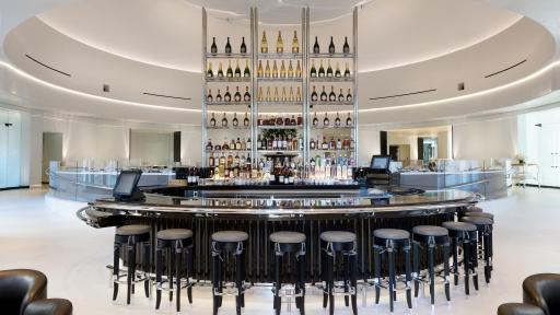 From the champagne lounge, guests travel up a set of private elevators to the nearly 1,600 sq. ft., restaurant. Once inside, they will discover a fully stocked wine room with more than 150 selections prominently featured behind a floor to ceiling glass partition. On the other side of the space is the lounge with plush bronze furniture and custom Clive Barker artwork, where guests wait for the maître d’ to escort them to the table. On the journey to the table, guests can appreciate the landscape of the round, white Venetian Plaster and Plexiglas lined dining room with outer banquette seating, the 150 plus Lily floral arrangement in the center, the bold dark wooden bar with shelves extending to the ceiling lined with the finest spirits and the large windows and French doors leading to the terrace overlooking the famous Garden of the Gods Pool Oasis. The nearly 250 seat restaurant includes three private dining rooms, bar seating and four terraces which will have seasonal seating.