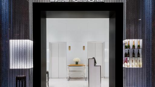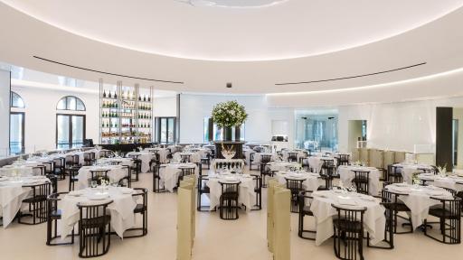 The focal point of the restaurant is the one-of-a-kind kinetic sculpture, suspended from a 60ft dome. Created by Chow and constructed by TAIT, the 3,800 lb. fiberglass and aluminum framed sculpture is coined “The Moon,” as in its inactive state it resembles a full moon. However, throughout each evening, the sculpture puts on a four-minute show as it maneuvers into various configurations. The outside of the sculpture is a crisp white, echoing the monochromatic coloring of the room, while the inside is Yves Klein Blue.