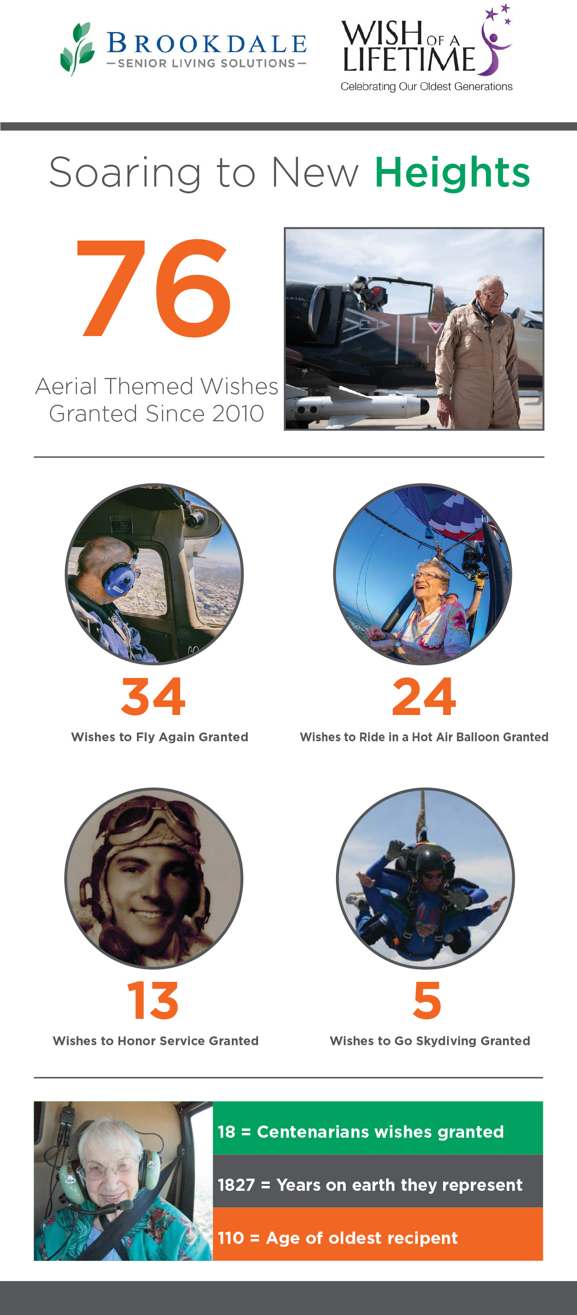 For the past six years Brookdale, the nation’s largest senior living provider, has fulfilled its residents’ life-long dreams and Wishes by partnering with Wish of a Lifetime™, an organization dedicated to shifting the way society views and values our oldest generation. During this time, some of the most exciting Wishes have taken place in the skies above. Since the partnership began, more than 70 aerial themed Wishes have been granted to Brookdale residents who had dreams of skydiving, taking helicopter tours, flying fighter jets and more.