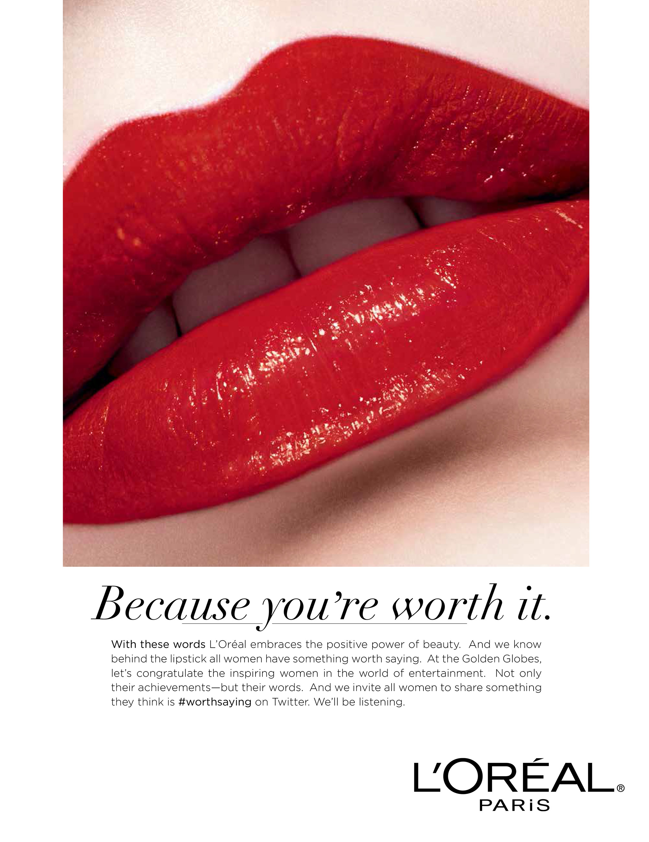 PR Newswire, New York, NY – January 6, 2016 - L’Oréal Paris believes women’s lips can be bold in more ways than one. For the first time, L’Oréal Paris is leveraging its red carpet authority and broadcast sponsorship of the 2016 Golden Globes to go beyond beauty with the launch of the #WorthSaying campaign. As recent award show red carpets have demonstrated, female celebrities are speaking out and sharing information about their work, careers, and other meaningful topics. Designed to propel this cultural shift, #WorthSaying, launching January 10, the night of the Golden Globes, encourages women on the carpet – and off – to share words they believe are truly worth saying.