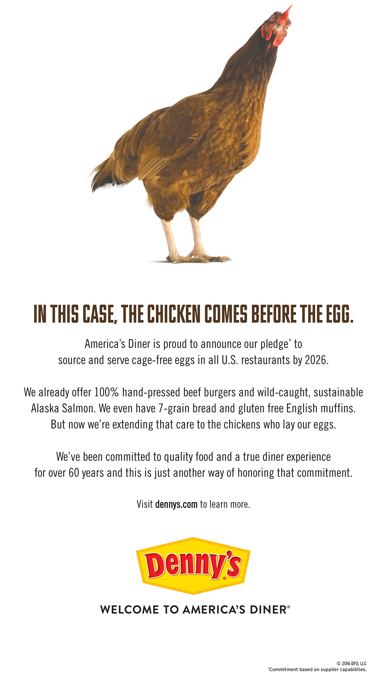 Greg Linford, Vice President of Procurement for Denny’s added, “As America’s Diner, we’re proud to do our part to move the industry toward more humane sourcing practices. This shift towards a more humane method of egg production is just another step in ethical sourcing at Denny’s, adding to our requirements for ethical turkey, beef and pork treatment as well. We look forward to working closely with our suppliers to promote responsible sourcing, and refining our strategies as information, availability and supply chain capabilities evolve.”
