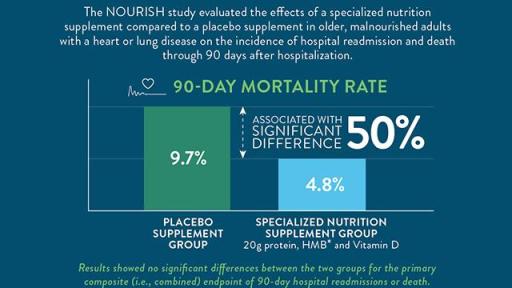 The NOURISH (Nutrition effect On Unplanned ReadmIssions and Survival in Hospitalized patients) study – one of the largest nutrition clinical studies of its kind – was a prospective, randomized, double-blind, placebo-controlled trial. The study was designed to build upon the body of evidence demonstrating that oral nutrition supplements may reduce complications, mortality and hospital readmissions in malnourished patients. Participants in the NOURISH study included 652 malnourished adults, aged 65 or older, who were admitted to the hospital and suffered from heart or lung disease. Researchers compared the effects of a specialized nutrition supplement with high protein (20 grams), HMB* (a muscle-preserving ingredient) and Vitamin D to a placebo supplement on rates of readmissions or death 90-days after leaving the hospital.