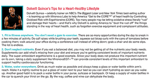 The launch of MironovaEGT+ coincides with New Year’s – a time of resolutions. In that spirit, Mironova Labs has teamed up with celebrity trainer Dolvett Quince (“The Biggest Loser”) to introduce “Get to the CORE™,” a nationwide campaign that challenges America to “Dust the Rust Off” anything standing in the way of better heart health – whether it be long-forgotten exercise equipment or complacent attitudes about diet and nutrition - and Control Oxidative Risk with Ergothioneine (CORE).