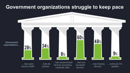 - 61% of Government organizations have at least one non-compliant device, compared with the global average of 53%.