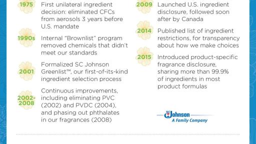 - 2014: Published list of ingredient restrictions for transparency about how SC Johnson makes ingredient choices.