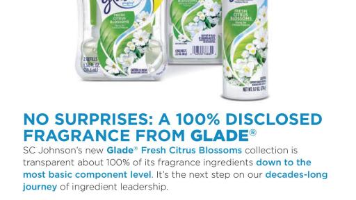 The new Glade® Fresh Citrus Blossoms collection goes beyond other air care products with its 100 percent fragrance transparency. All fragrance ingredients are listed on the products and on SC Johnson’s WhatsInsideSCJohnson.com ingredient website.