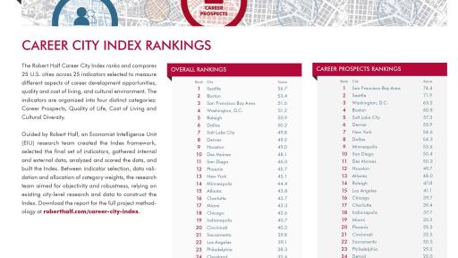 Which cities offer the best career prospects, and would you be open to moving for the right job? Two new reports from Robert Half shed light on these questions. The Robert Half Career City Index, commissioned by Robert Half and developed by The Economist Intelligence Unit (EIU), ranks Seattle, Boston, San Francisco, Washington, D.C. and Raleigh as the top five career locations overall based on four factors: career prospects, cost of living, quality of life and cultural diversity. Dallas, Salt Lake City, Denver, Houston and Des Moines round out the top 10.