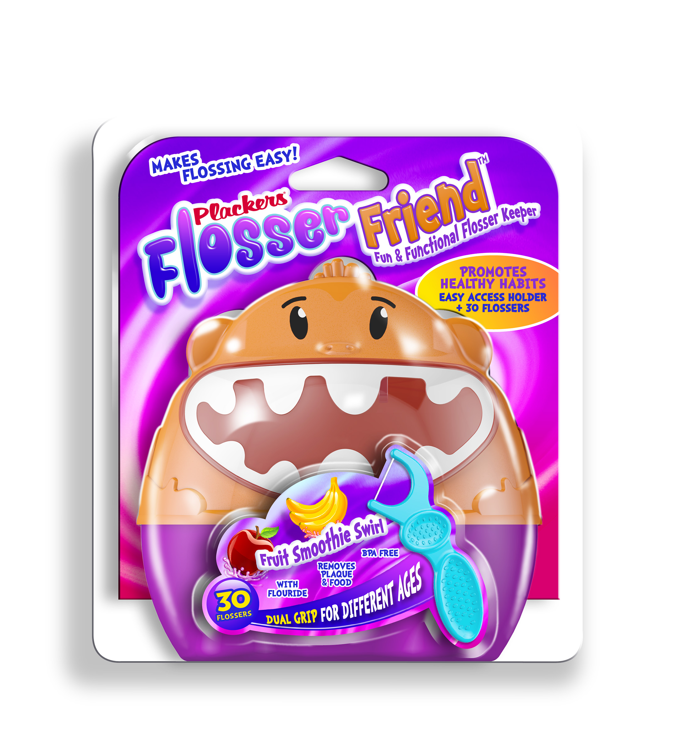 Plackers enhances the overall flossing experience for kids with its new Flosser Friend™. The adorable monkey-shaped flosser holder is meant to amp up the fun factor and help kids look forward to flossing. Not only is the flosser holder a cute way to store kids’ flossers and keep them close at hand, its flip-up cover design allows kids to easily access their flossers. The Flosser Friend is easy to open and clean, and comes pre-packaged with 30 dual grip kids’ flossers.
