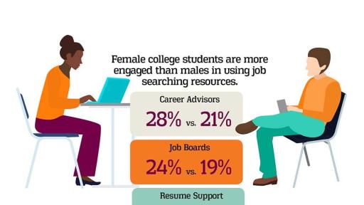 - At the same time, some results suggest that women might be somewhat more engaged in their job search than men. They are more likely to report an intention to “often” use such on-campus resources as career advisors (28 percent compared to 21 percent), job boards (24 percent compared to 19 percent), resume support (21 percent compared to 18 percent) and interview help (19 percent compared to 16 percent).