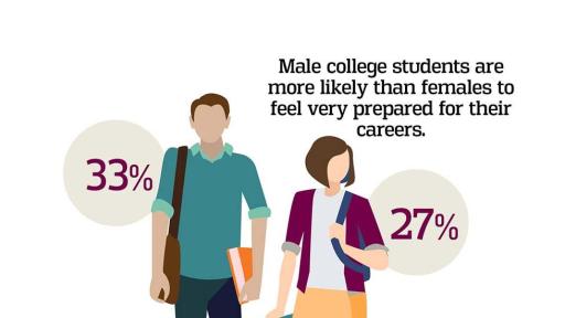 - Men are more likely than women (33 percent compared to 27 percent) to report that they feel “very prepared” for their careers, even though women are more likely to report that they are “satisfied” with the learning and educational aspects of their college experience (86 percent compared to 79 percent).