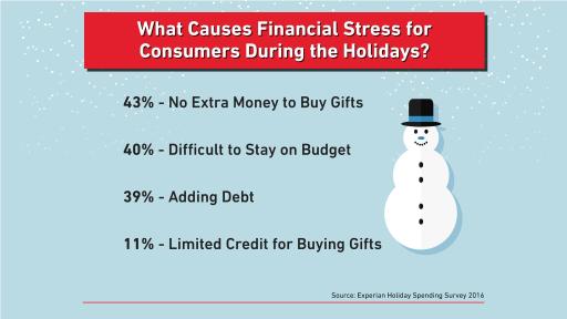 ’Tis the season to be jolly — but it’s not so jolly for many consumers, as the holidays can cause financial stress and often put consumers into debt. According to a nationwide survey from Experian, the primary reason is that most consumers don’t create budgets and are unprepared to cover added expenses beyond gifts, such as postage costs, hostess gifts, gift-wrapping supplies and greeting cards.