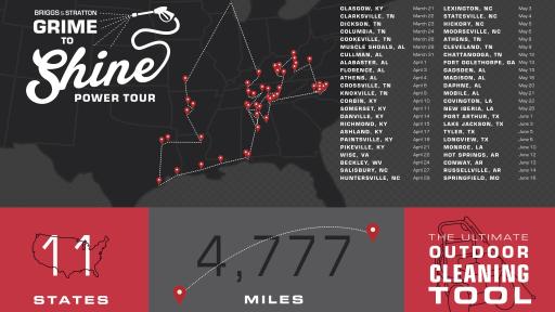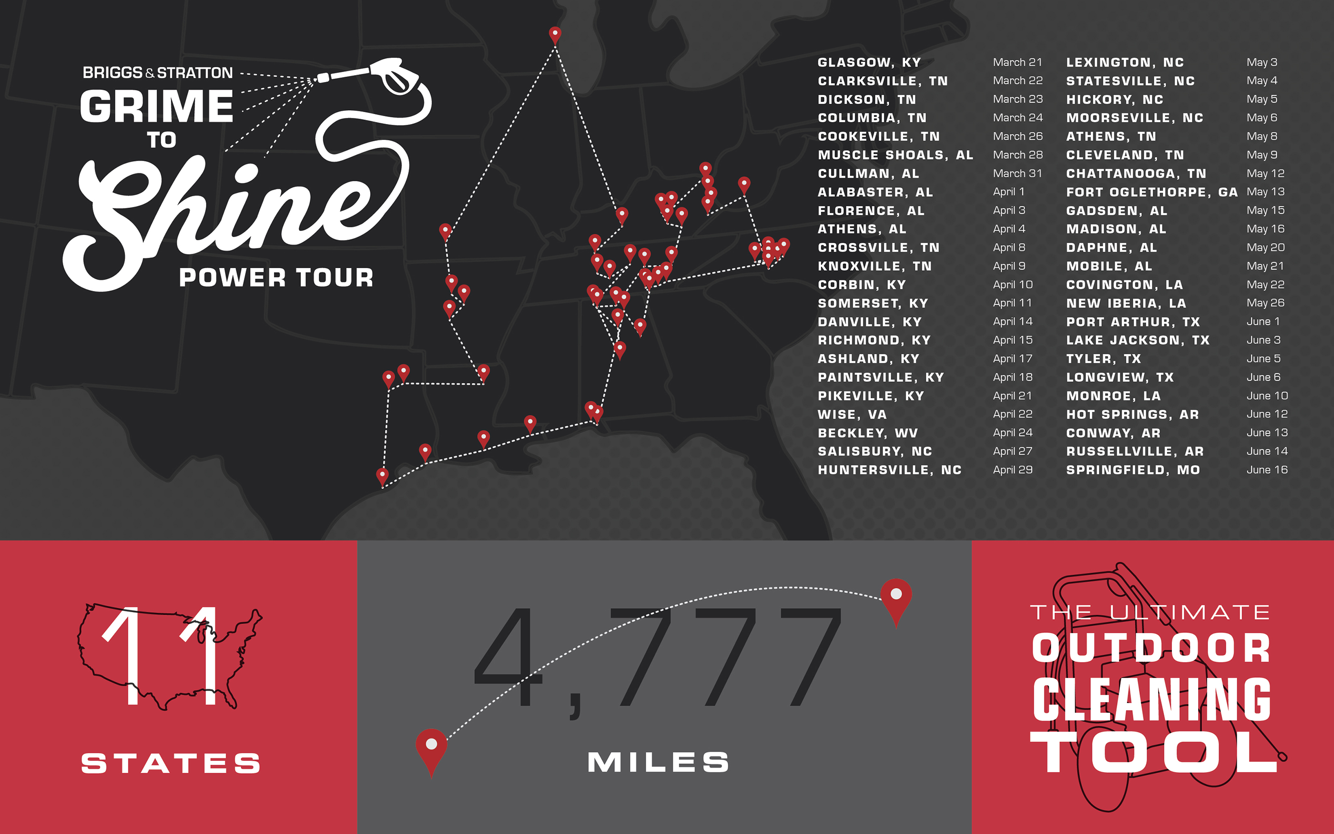 “Whether you’re a new homeowner with little outdoor cleaning experience, a DIYer who takes pride in maintaining your home and property, or a professional contractor looking for a reliable commercial pressure washer, Briggs & Stratton has a cleaning system to accomplish your goals,” said Dan Roche, marketing director for Briggs & Stratton’s Portable Power and Cleaning Systems division. “At the Briggs & Stratton Grime To Shine Power Tour events, we’ll have pressure washers available for customers to test and get a first-hand feel for how easy it is to get some serious cleaning done.”