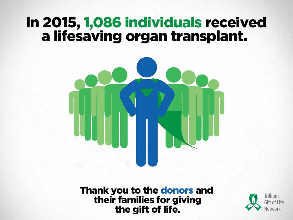 Trillium Gift of Life Network is a not-for-profit agency of the Government of Ontario responsible for planning, promoting, coordinating and supporting organ and tissue donation for transplantation across Ontario and improving the system so that more lives can be saved.
