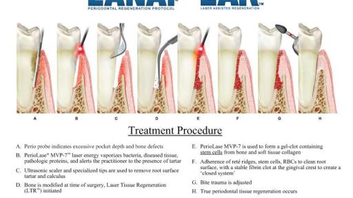 “Periodontal regeneration – true regeneration of the attachment apparatus (new cementum, new periodontal ligament, and new alveolar bone) on a previously diseased root surface when used specifically in the LANAP® protocol.”
