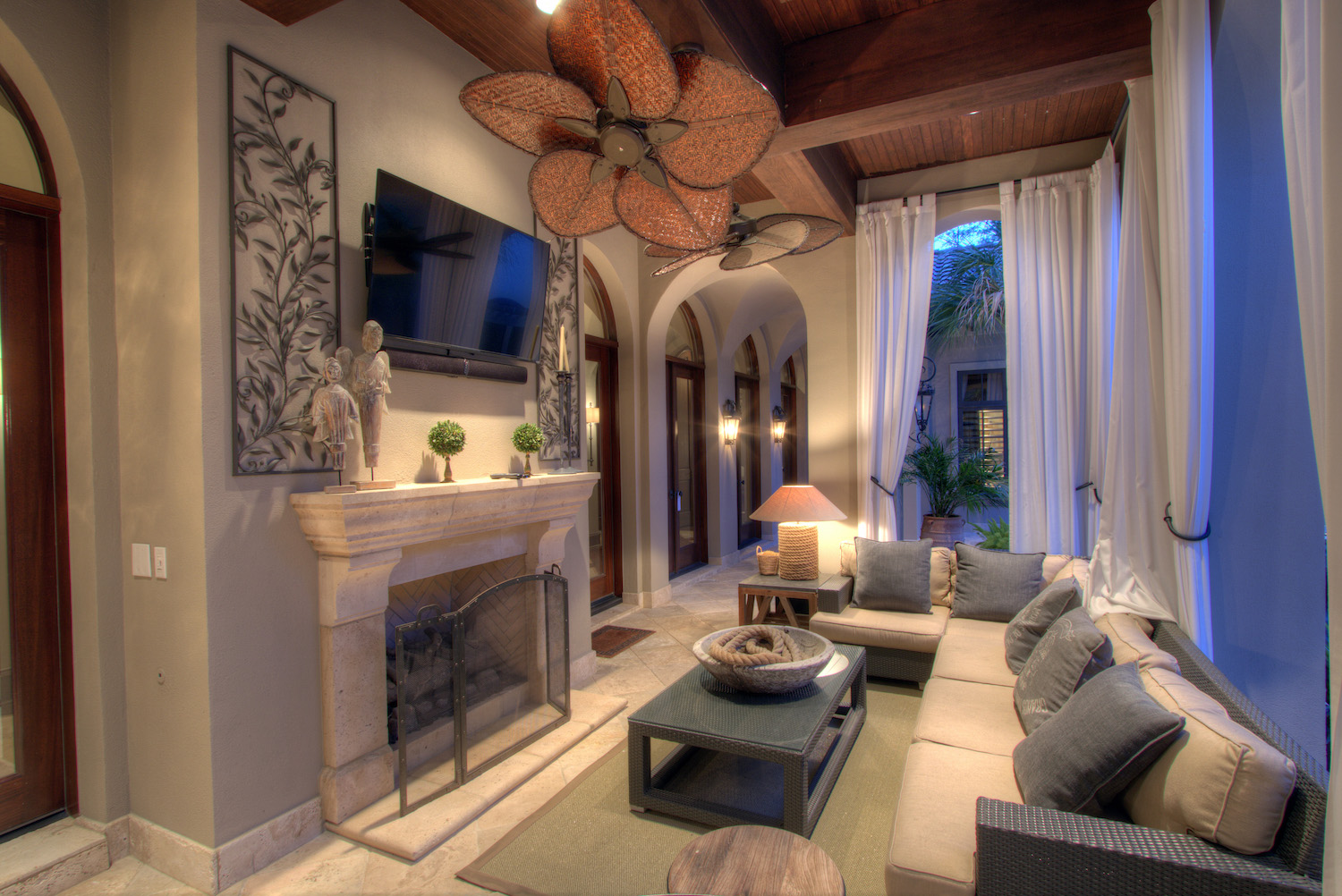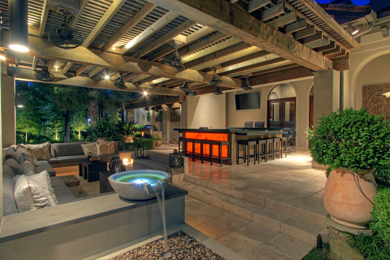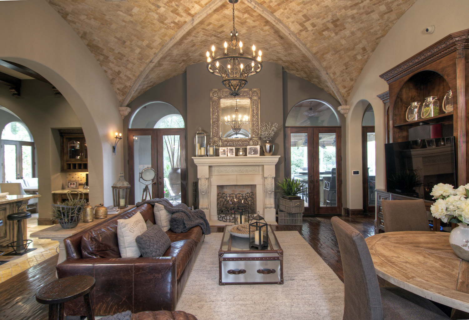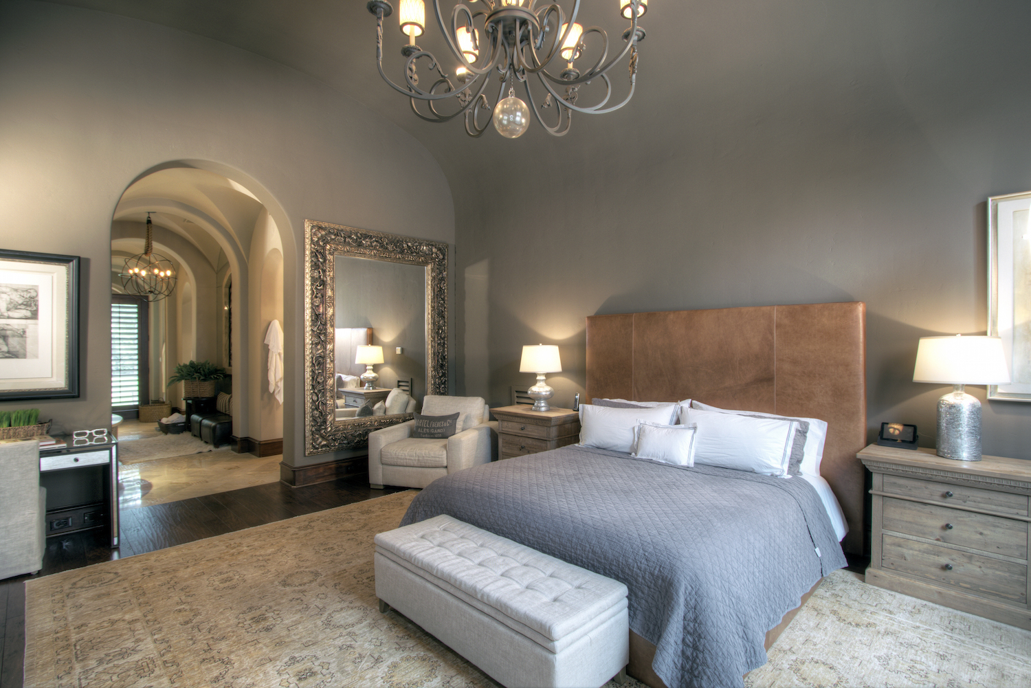 The residence is opulent at every turn, perfect for the discerning buyer who may want to host large gatherings or enjoy their own private retreat. Three kitchens – the main chef’s kitchen, a catering kitchen, and an outdoor summer kitchen – make preparing culinary delights for any size gathering effortless; while the formal dining room, with floor-to-ceiling windows and an adjacent onyx lighted bar, is the perfect place for cocktails and conversation. For more private living, Regency Woods offers a stunning master suite, complete with a masterfully-curved ceiling and serene views of the courtyard. A series of three groin ceilings reveal a jetted spa tub, oversized walk-in shower, and his and her closets in the master en-suite.
