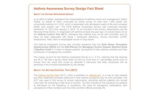 The State of Uncontrolled Asthma Patients in America Survey, conducted by Kelton Global on behalf of GSK between December 2015 and January 2016, included 1,016 patients who scored 5-19 on the Asthma Control Test (ACT) – a level of asthma management considered to be “uncontrolled.”