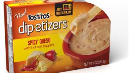 - NEW TOSTITOS DIP-ETIZERS Spicy Queso heats up the party with red bell peppers and cracked red pepper added to Tostitos crowd-pleasing microwaveable queso for a spicy, mouthwatering flavor that goes from pantry to microwave to party in just minutes.