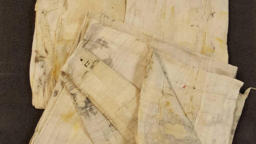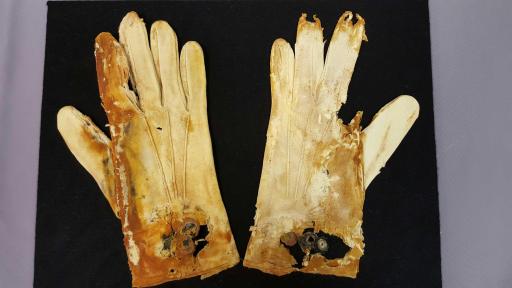 - Pair of Gloves: This degraded pair of cotton gloves was originally white and probably belonged to a gentleman. They are still attached at the cuff, so they had not yet been worn. The gloves were recovered from a suitcase containing unmarked pajamas, jackets, and other clothing.