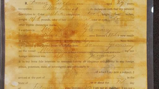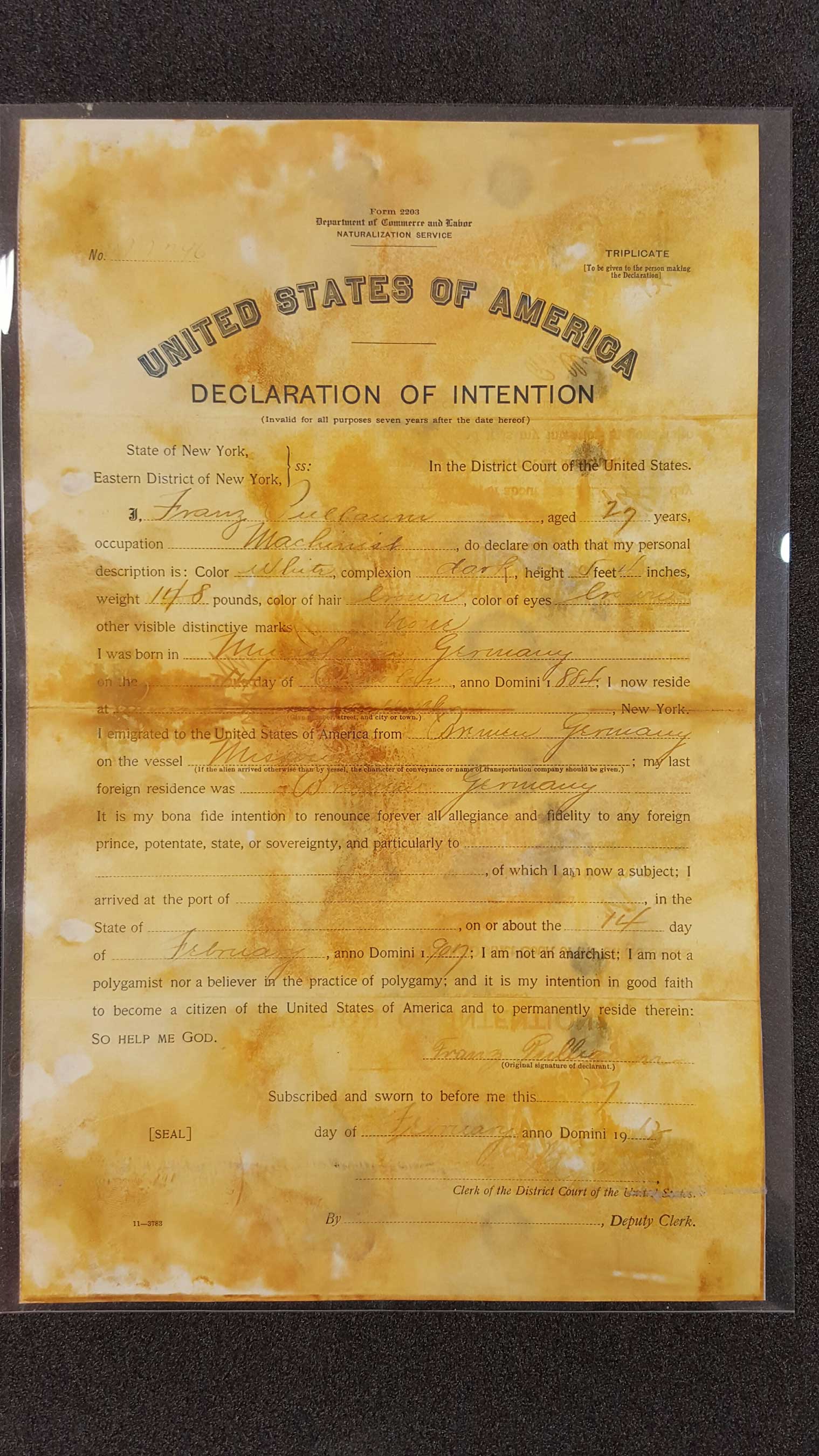 - Declaration of Intention Form: 2nd class passenger Franz Pulbaum, a machinist originally from Germany, clearly intended to become a U.S. citizen upon his return to New York City. He had been on a business trip to Luna Park amusement park in Paris. The form would have been used to allow him a smooth disembarkation. Pulbaum’s signature and personal information is still legible on the naturalization form. Pulbaum never became a U.S. citizen, he went down with Titanic.
