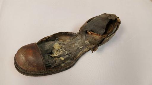 - Left Shoe: This men's leather shoe fragment consists of the welt, top cap and partial quarter with the insole. Attesting to the meticulous care under which all artifacts are conserved, this shoe has never been previously exhibited due to its fragile condition. This will be its first and only time on public display.
