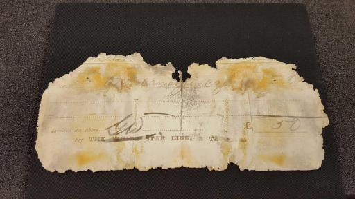 - White Star Line Receipt for “One canary in Cage”: Recovered from Marion Meanwell’s alligator purse, this small receipt fragment appears to confirm that 3rd class passenger, Mrs. Meanwell (nee Mary Ann Ogden), a milliner from Eastbourne Sussex, England agreed to transport a relative’s canary from Southampton to Cherbourg. Additional information suggests that Chief Purser Hugh Walter McElroy took responsibility for the bird, while transport payment was provided by Mrs. Meanwell.