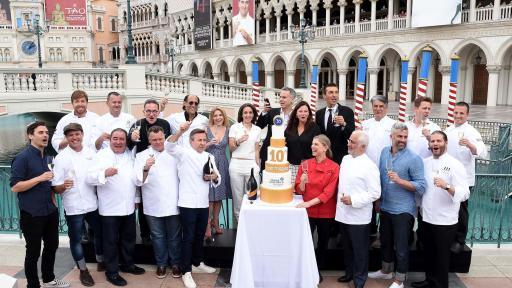 Joined by Pamela Drucker Mann, Publisher & Chief Revenue Officer of Bon Appétit & Epicurious, Cathy Tull, Senior Vice President of Marketing for Las Vegas Convention and Visitors Authority and Sabrina Keraudren, Senior Marketing Manager for Mionetto USA, Adam Rapoport, Editor in Chief of Bon Appétit, welcomed the group and thanked the chefs for their continued support of Vegas Uncork’d by Bon Appétit over the years. Additionally, the group was presented with a custom six-tier Vegas Uncork’d by Bon Appétit cake created by “Cake Boss” Buddy Valastro to celebrate the 10th anniversary. Following the cake presentation and ceremonial saber off, Daniel Boulud led the chefs in a toast to commemorate the occasion.