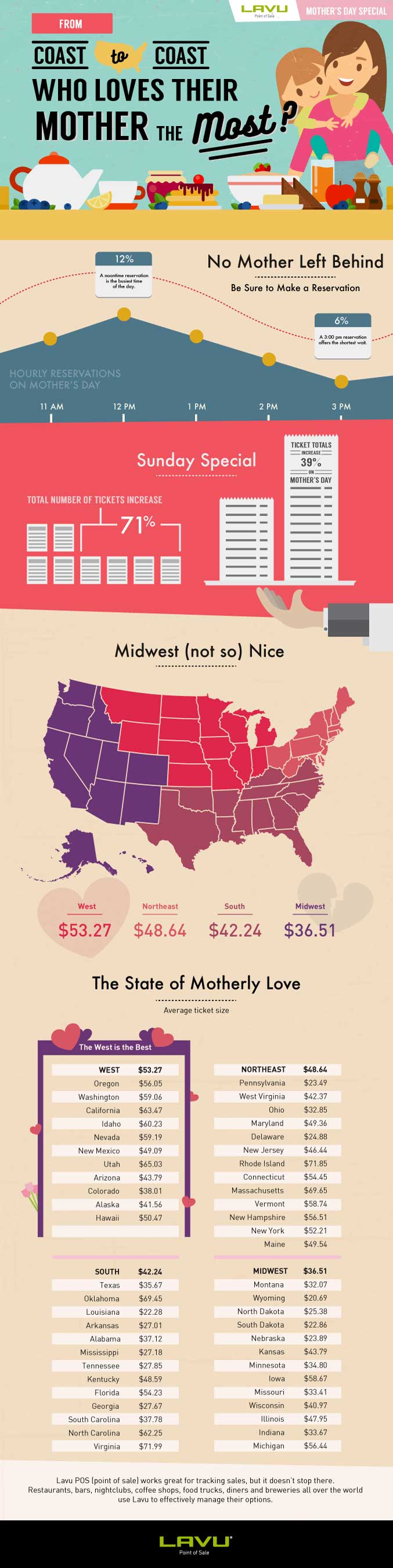 We were interested to see which states love their mothers the most. Perhaps unsurprisingly, a southern state wins. Virginia, with an average ticket size of $71.99 narrowly edges out Rhode Island ($71.85). When looking at regional trends though, neither the South ($42.24) or Northeast ($48.64) can hold a candle to the West ($53.27). The Midwest apparently has a bone to pick with their mothers who spend $36.51 on their Mother’s Day tabs, a full 13% less than the next closest region. We recommend flowers.