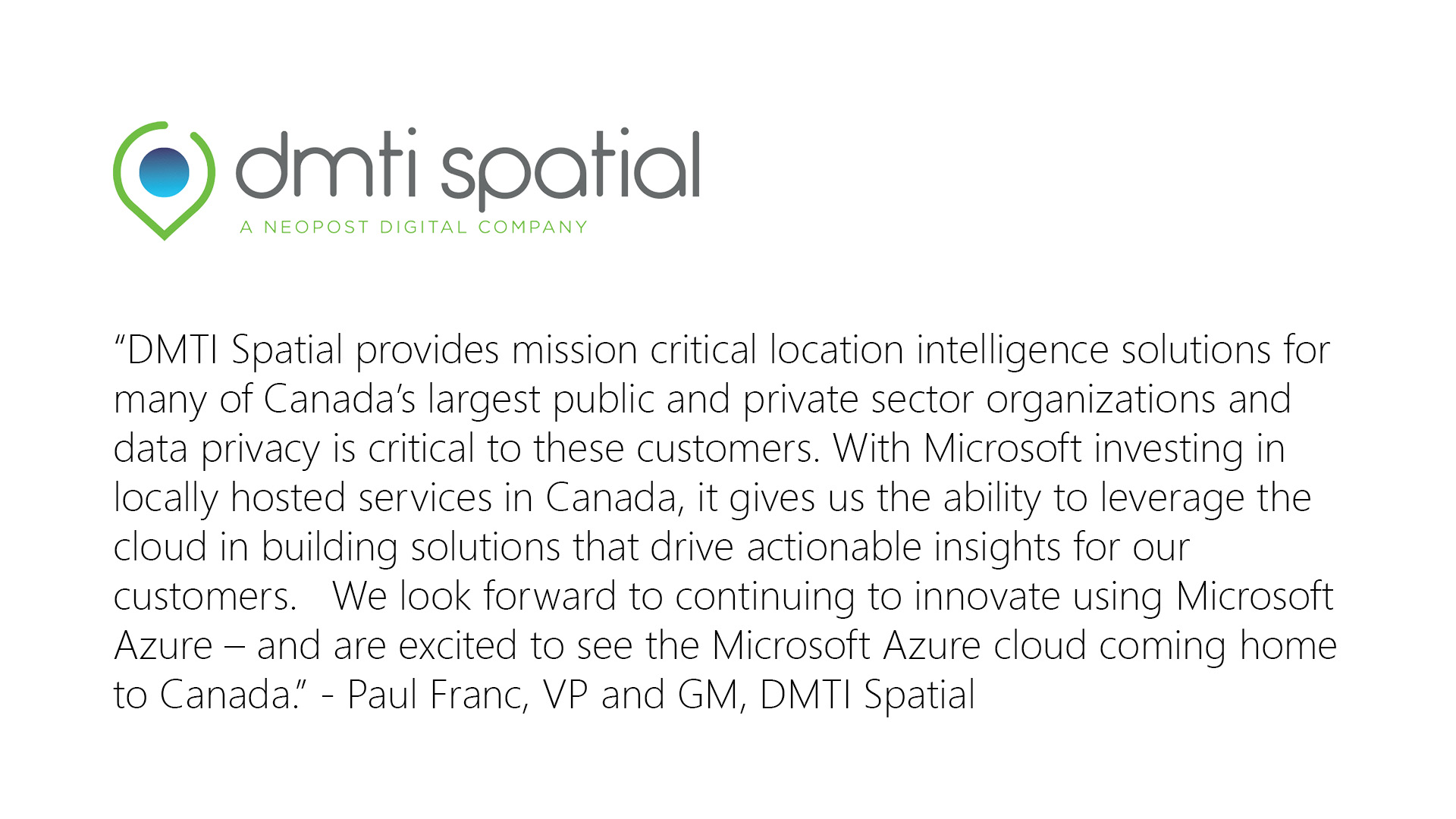 “Our goal is to deliver Canada’s most trusted and complete cloud to power Canadian businesses and governments and ultimately enable them to achieve greater impact. By offering fully integrated cloud services, we create simple, cost-effective solutions that empower our customers.” said Janet Kennedy, president of Microsoft Canada. “And, the Microsoft Cloud in Canada and across the globe features the same industry-leading levels of security, privacy and control, compliance and transparency.”