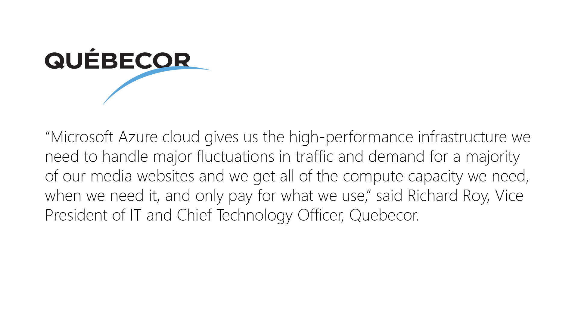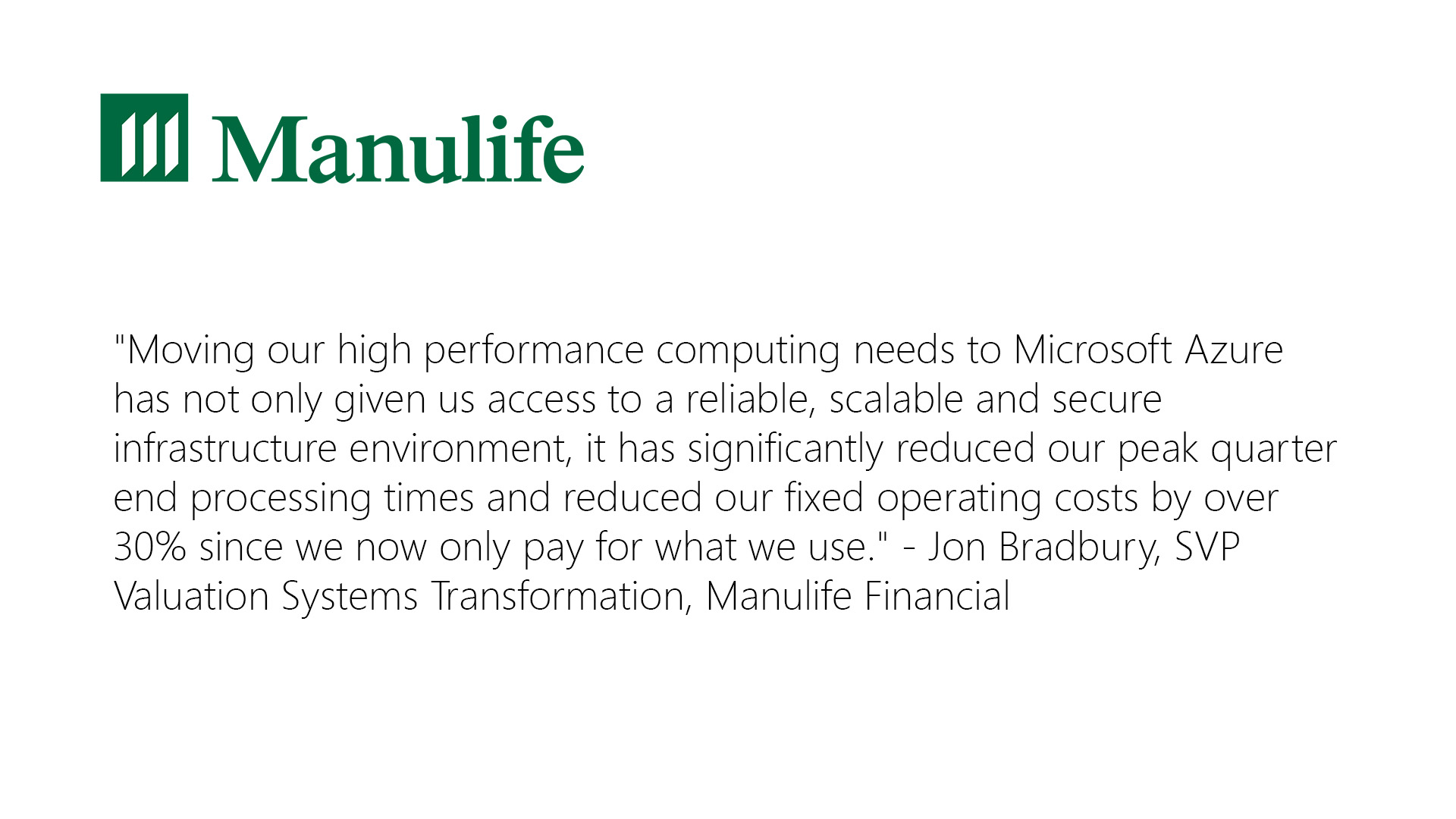 Many Canadian customers and partners are already powered by the Microsoft Cloud. These customers include Manulife Financial; one of Canadas leading financial services companies whose mandate is to provide forward thinking solutions to help people with their big financial decisions. They describe their move to the Microsoft Cloud as follows: “Moving our high performance computing needs to Microsoft Azure has not only given us access to a reliable, scalable and secure infrastructure environment, it has significantly reduced our peak quarter end processing times and reduced our fixed operating costs by over 30% since we now only pay for what we use.”