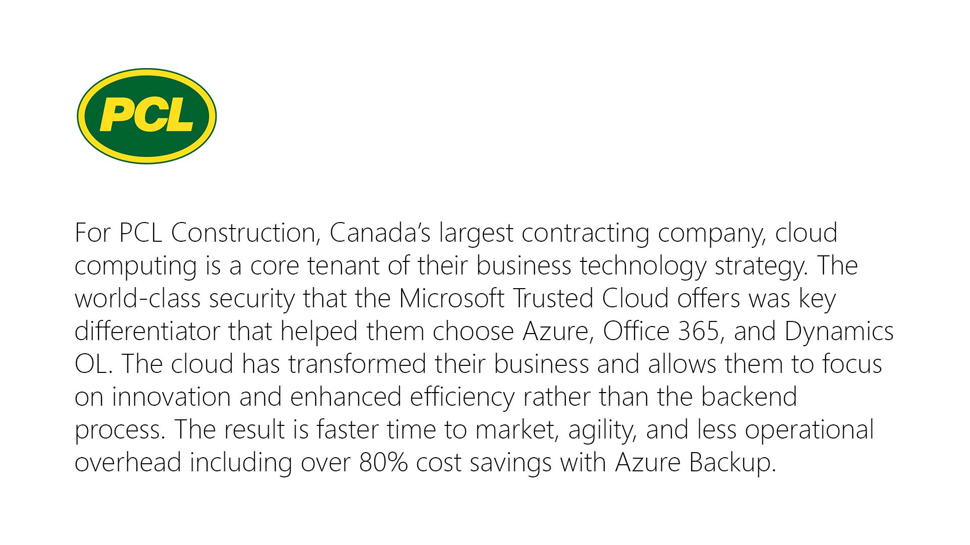 Today’s announcement in Canada brings the total number of generally available Azure regions to 24 globally, more than any other cloud provider, all backed by a $15 billion (USD) investment in global datacentre infrastructure. This enables customers like PCL, Canada’s largest contracting company, to have a unified infrastructure in all the countries they operate. The cloud has transformed their business and allows them to focus on innovation and enhanced efficiency rather than the backend process. The result is faster time to market, agility, and less operational overhead including over 80% cost savings with Azure Backup.