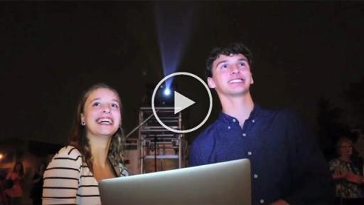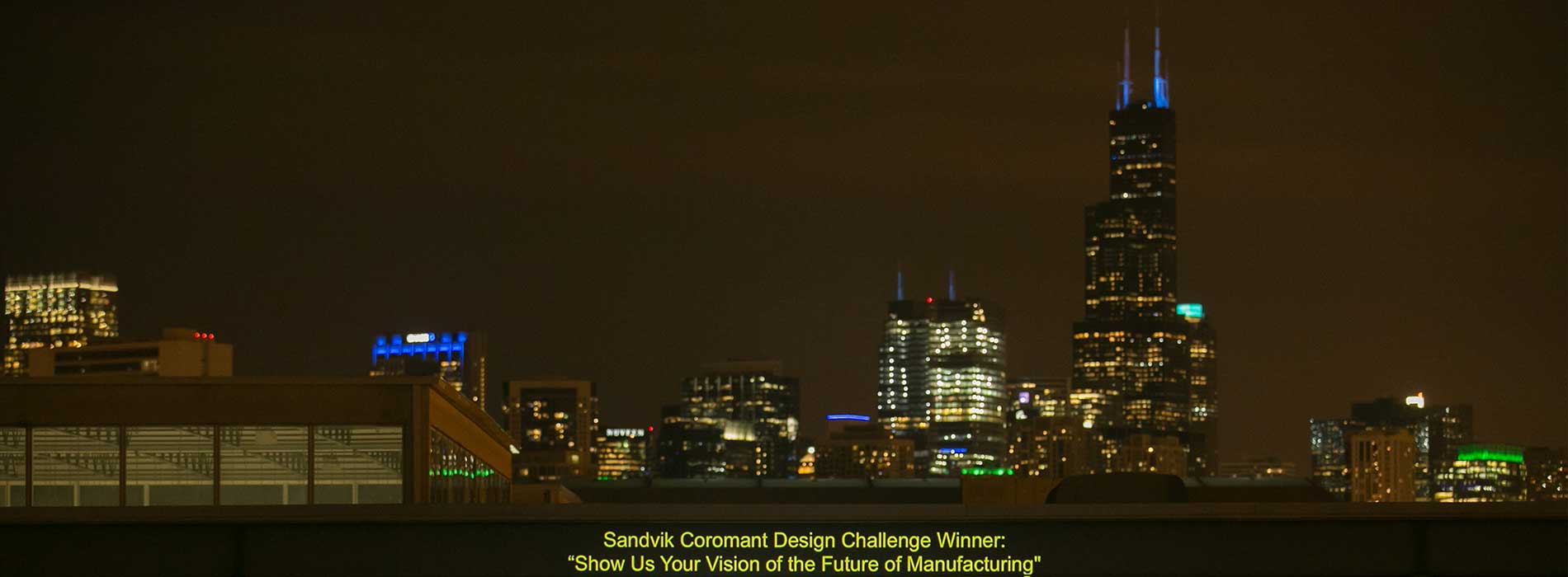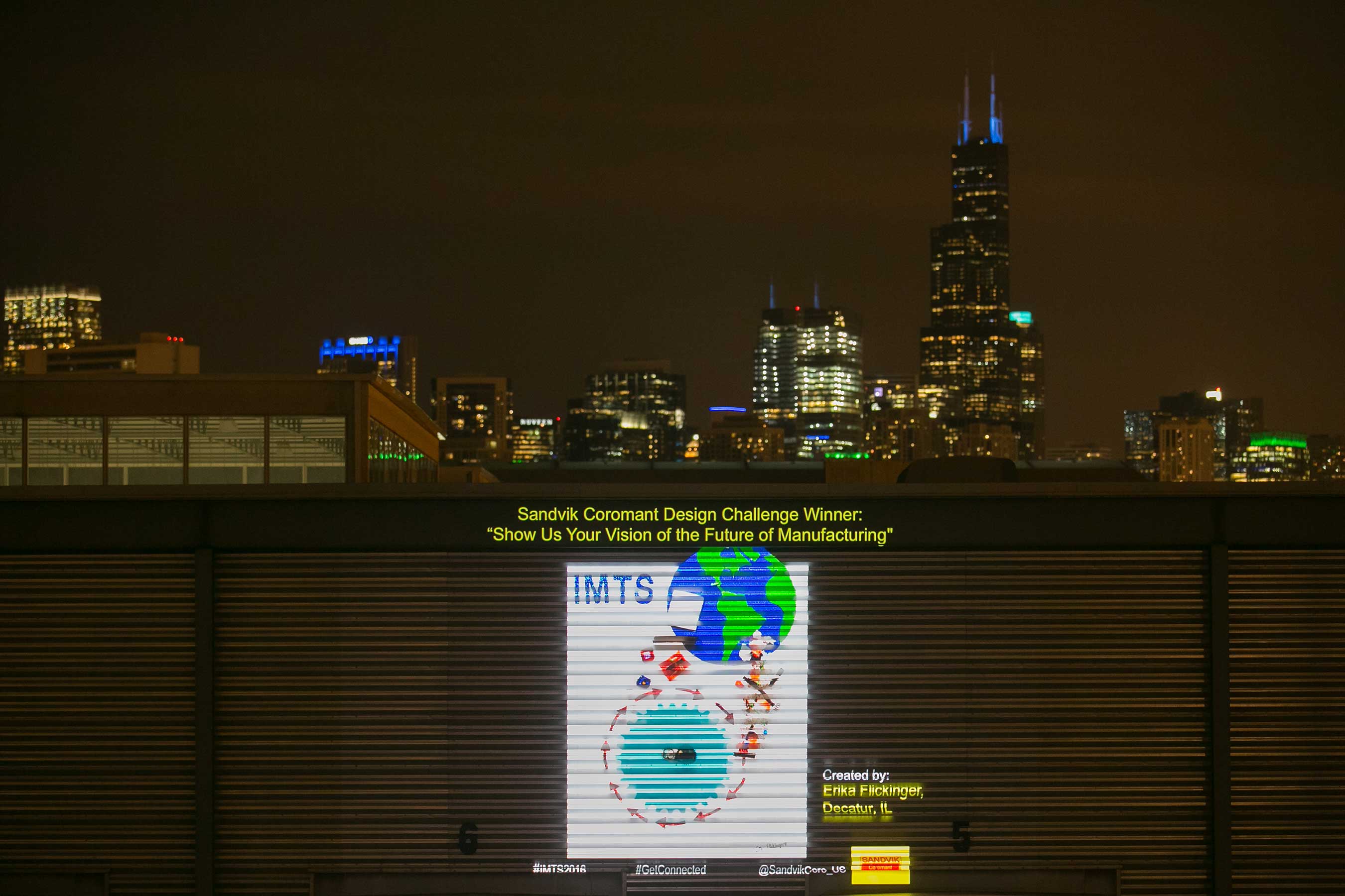 Last night Sandvik Coromant, a global leading supplier of cutting edge tools, tooling solutions and know-how to the metalworking industry, lit up the Chicago skyline with insightful images designed to spread the word about the profound impact data and technology has on the manufacturing industry and people’s daily lives. The display also included inspirational images depicting the future of digital manufacturing created by Samuel and Erika Flickinger, a brother and sister from Decatur, IL. The two students, who participated in STEM education “Dream It. Do It.” summer camps created by The Manufacturing Institute, literally helped ‘flip the switch’ on the light show and also each received a $1,000 check toward their future education.