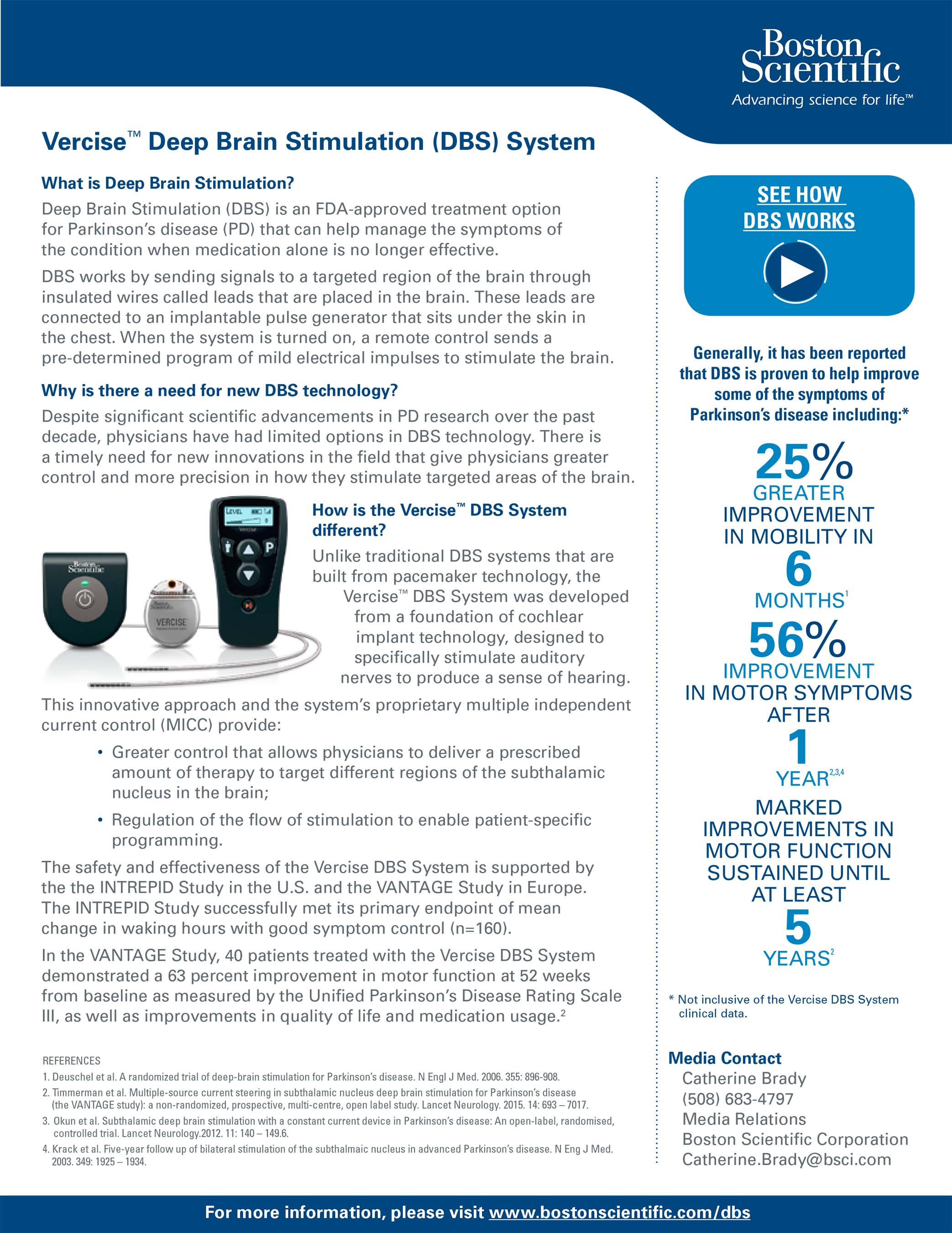 The approval was based on the INTREPID study, the first multi-center, prospective, double-blind, randomized sham-controlled study of DBS for PD in the U.S. The INTREPID study evaluated the safety of the system in 292 patients at 23 sites and also evaluated its effectiveness. It successfully met its primary endpoint of mean change in waking hours with good symptom control (n=160). Data from the INTREPID study is expected to be released in 2018. The filing was also supported by safety data from the European multi-center, prospective, single-arm VANTAGE study. In the VANTAGE study, 40 patients treated with the Vercise DBS System demonstrated a 63 percent improvement in motor function at 52 weeks from baseline as measured by the Unified Parkinson’s Disease Rating Scale III, as well as improvements in quality of life and medication usage.2