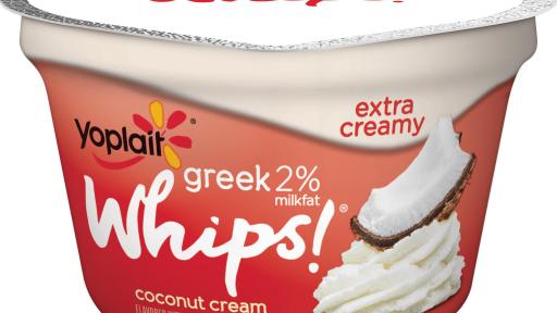 - Yoplait Greek 2% Whips! - Yoplait’s Greek 2% Whips! are made with 2 percent milkfat for a thicker, richer and extra creamy texture. Available in four family-pleasing flavors: Vanilla Cream, Coconut Cream, Strawberries ‘n Cream and Cherries ‘n Cream.
