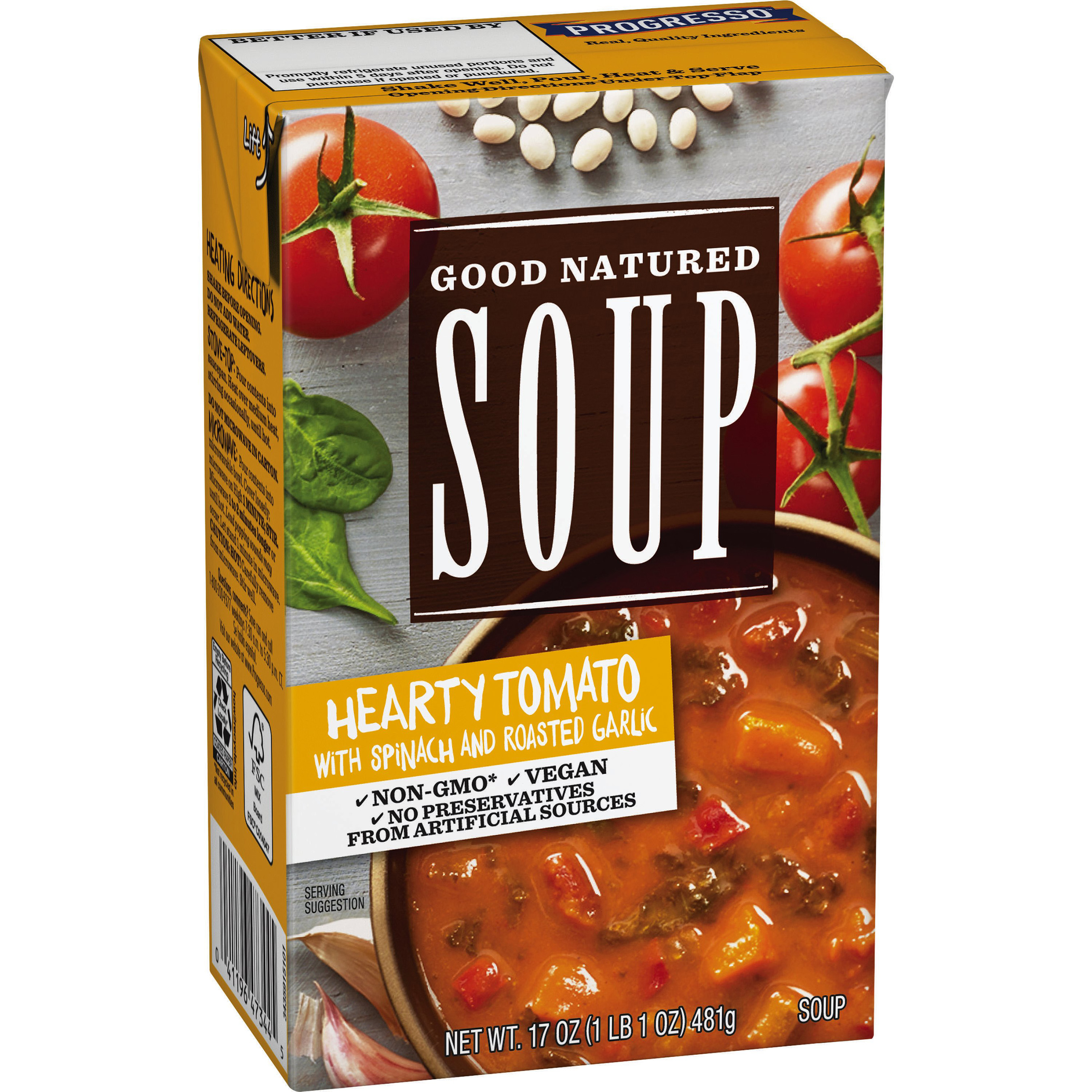 - Good Natured Soups by Progresso – This new line of delicious, hearty and flavorful vegetable soups are non-GMO, vegan and contain no preservatives from artificial sources. Available in Hearty Corn & Chipotle Chowder, Hearty Tomato with Spinach & Roasted Garlic, and Hearty Lentil with Garden Vegetables.