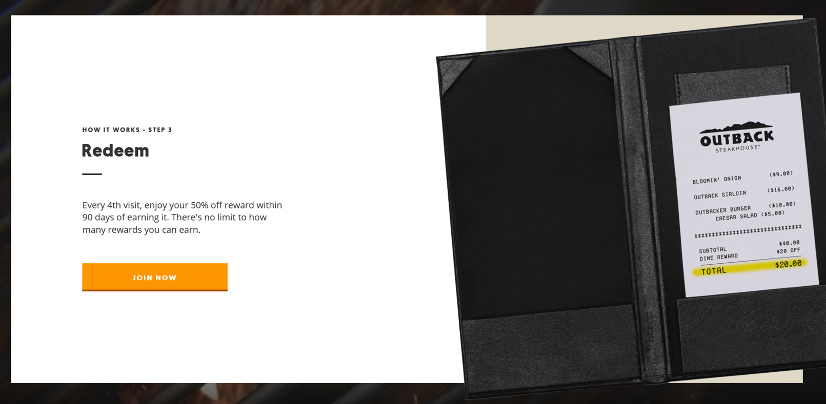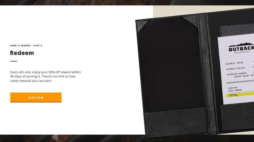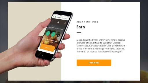 Dine Rewards™ is free to join and the rewards begin immediately. After signing up online, members will receive an incentive of $5 off* at Outback Steakhouse®, Carrabba’s Italian Grill®, or Bonefish Grill®; or $10 off* at Fleming’s Prime Steakhouse & Wine Bar®.