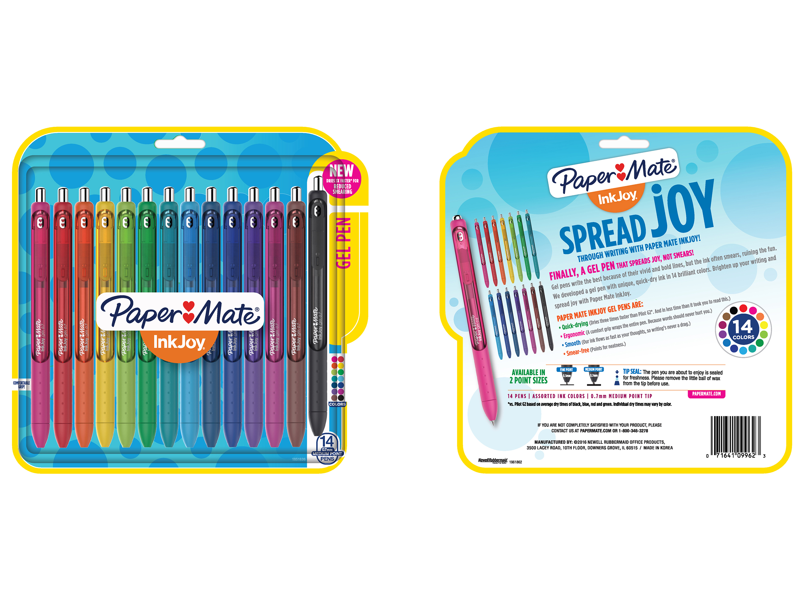 The new Paper Mate® InkJoy® Gel Pens™ are available in pack sizes ranging from 1 to 14 pens with an MSRP of $3.07 to $42.00 at a variety of retailers nationwide including Amazon.ca, Staples, Walmart and London Drugs. With a vivid gel ink that dries 3X faster1 for reduced smearing – it’s like a party on the page where smudges aren’t invited. With 14 brilliant colours to choose from, your notes will be bright and filled with fun.