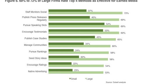 - Earned media was rated as “More” or “As Effective” as paid media by 81% of small firm marketers vs. 73% at large firms; and
