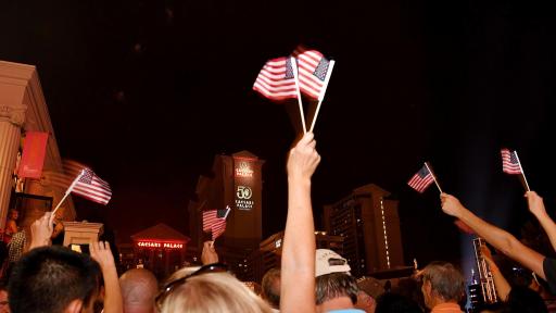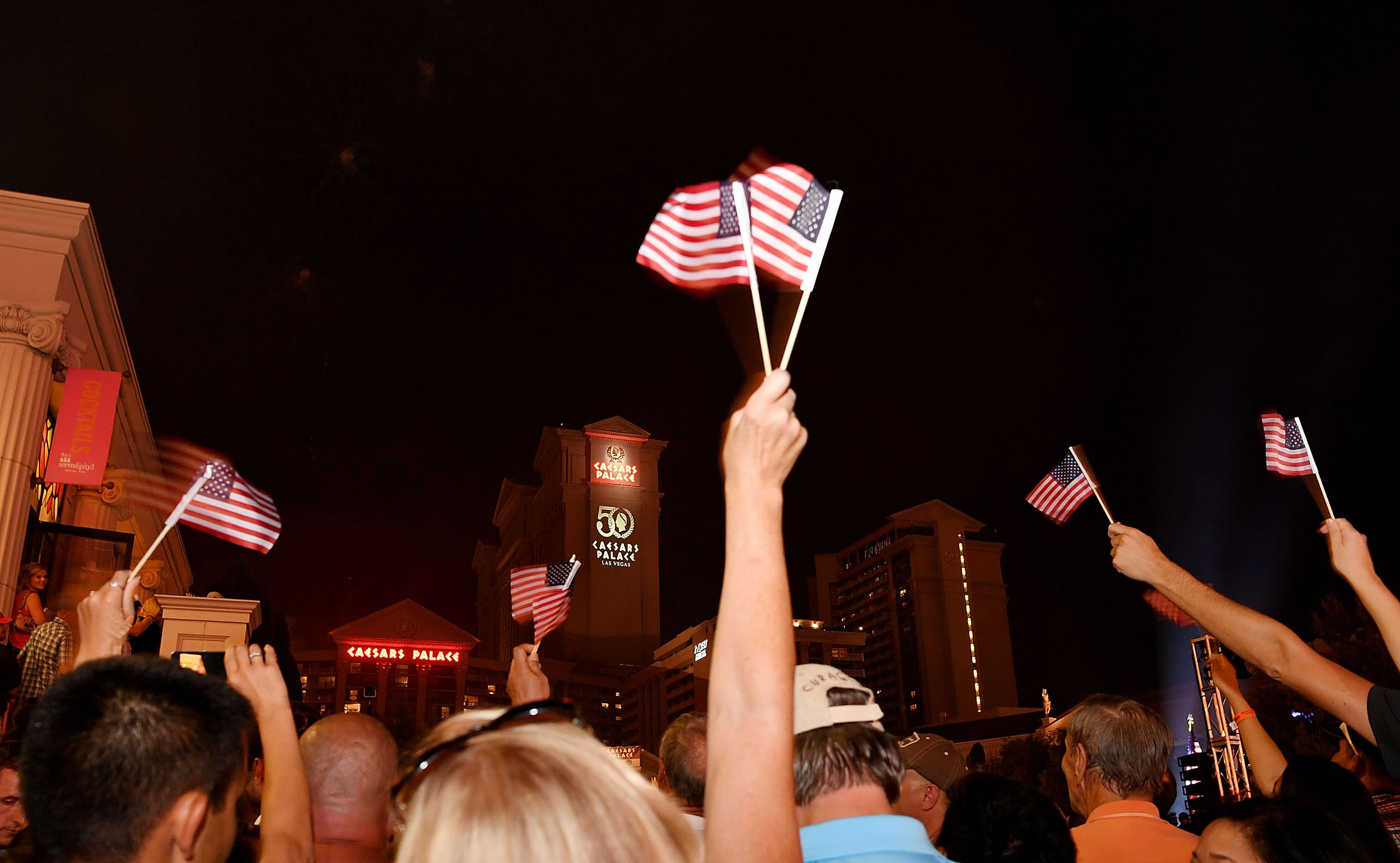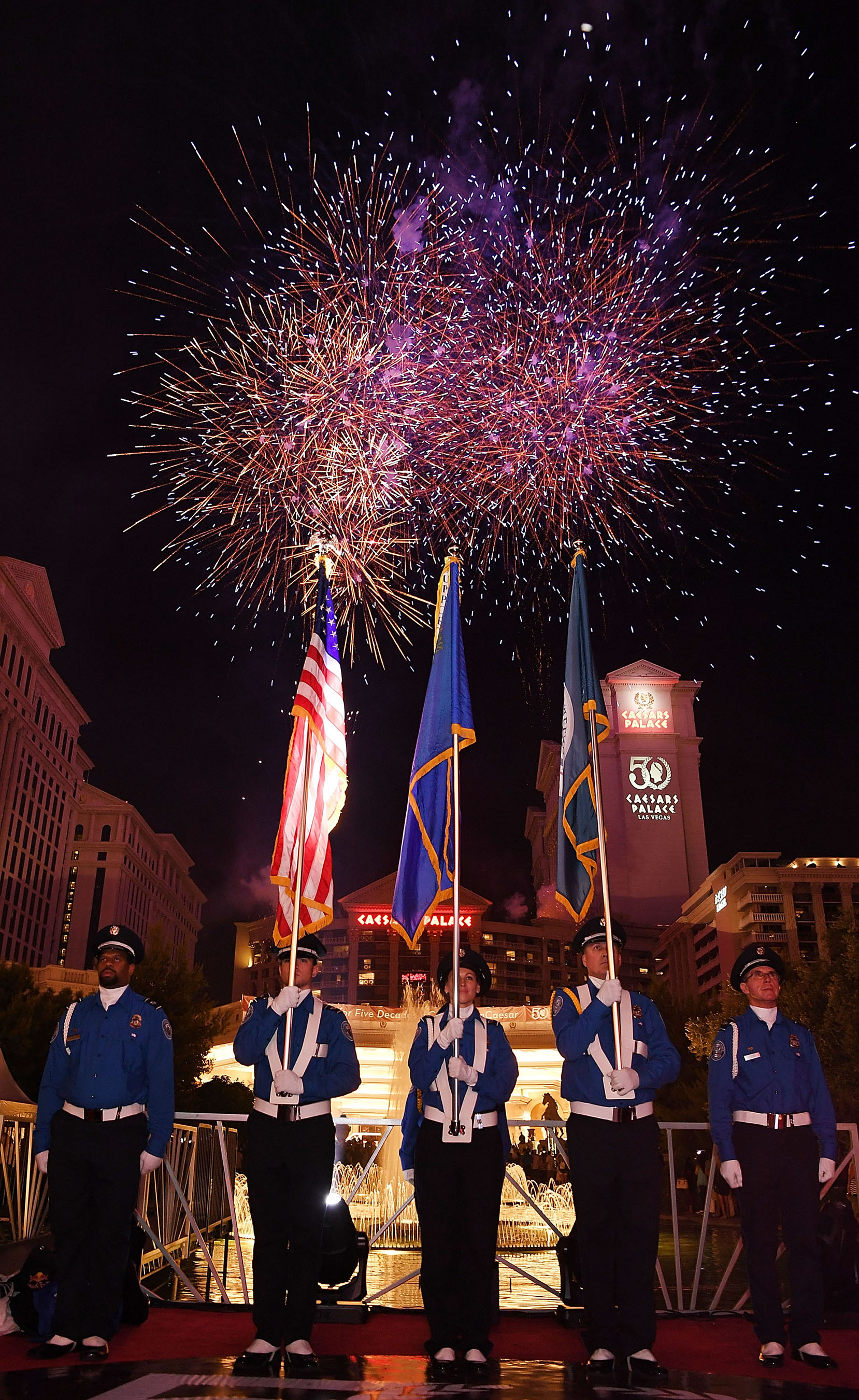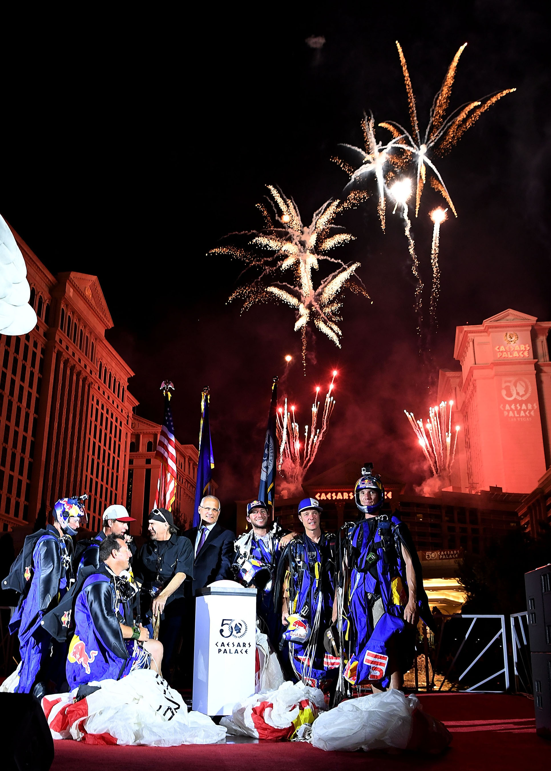 Wearing illuminated wingsuits equipped with red, white and blue LED lights, the Red Bull Air Force made their adrenaline-pumping jump, skillfully landing on the famed Las Vegas Strip directly in front of Caesars Palace. Guests waved American flags and patriotic signs as the team took to the front fountain stage, joining Gary Selesner, President of Caesars Palace and daredevil Robbie Knievel for the launch of the astonishing fireworks display. Lasting 13 ½ minutes, the show filled the skies above the re-imagined Julius Tower at Caesars Palace.