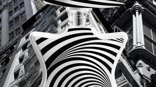 The Soho superstar bottle, with its mesmerizing black and white whirlpool swirls, is a stunning, high-energy visualization of the scent inside, but with an extra-added surprise: a removable matching elliptical hat, complete with swirls, perched smartly atop the cap.