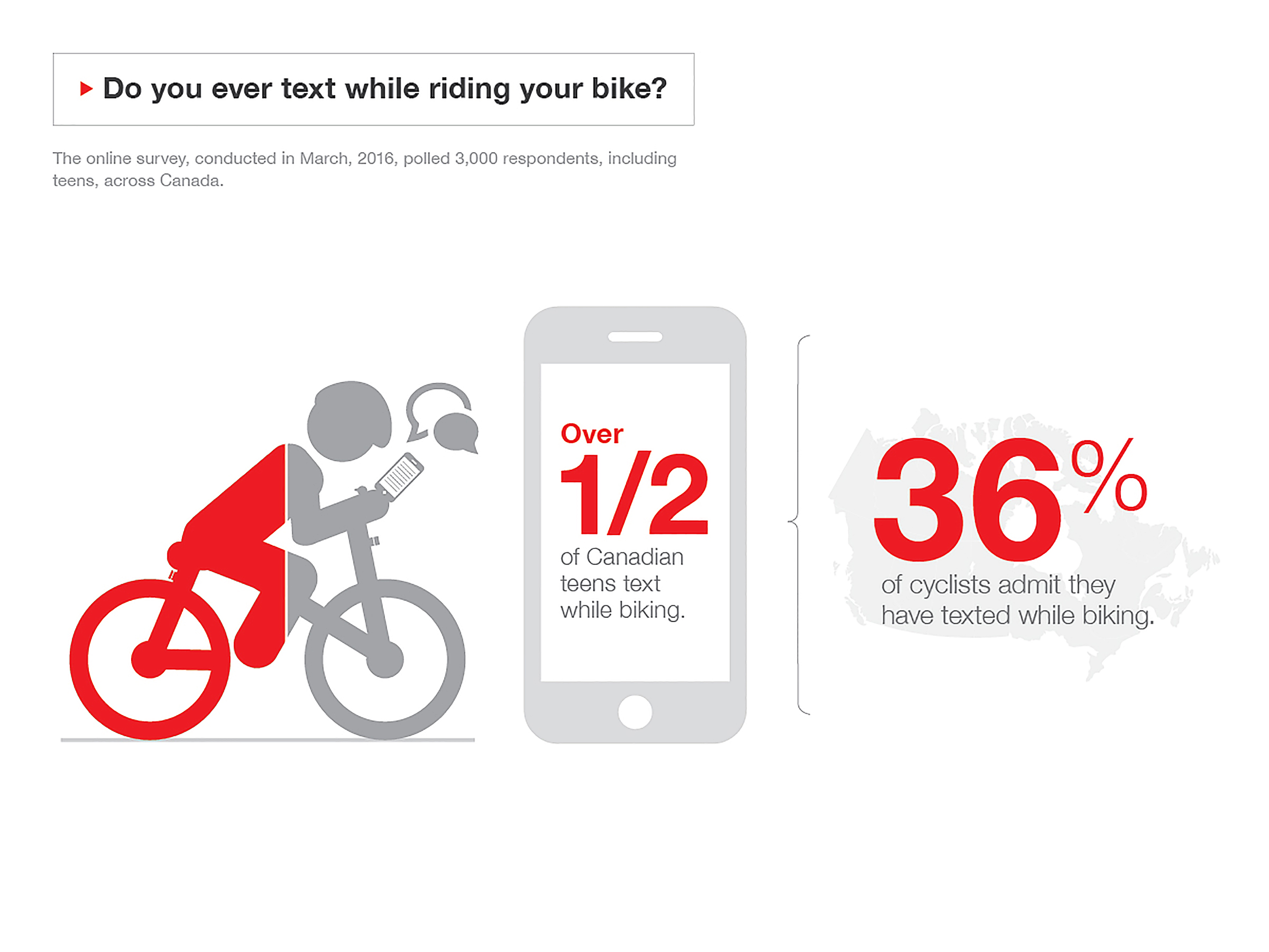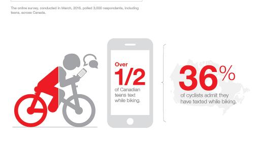 Cycling can be dangerous enough, according to Statistics Canada close to 7,500 cyclists are seriously injured every year, but the danger increases if a cyclist is impaired or distracted. Alarmingly, 36 per cent of cyclists who say that they ride on busy streets and more than half of Canadian teens admit to texting while biking.