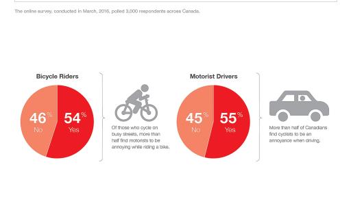 Friction between cyclists and motorists is well-known. According to a recent national survey from State Farm Canada, 55 per cent of Canadian drivers find cyclists to be an annoyance on the road. But it’s a two-way street, almost the same number (54 per cent) of cyclists find motorists to be annoying while they’re biking.