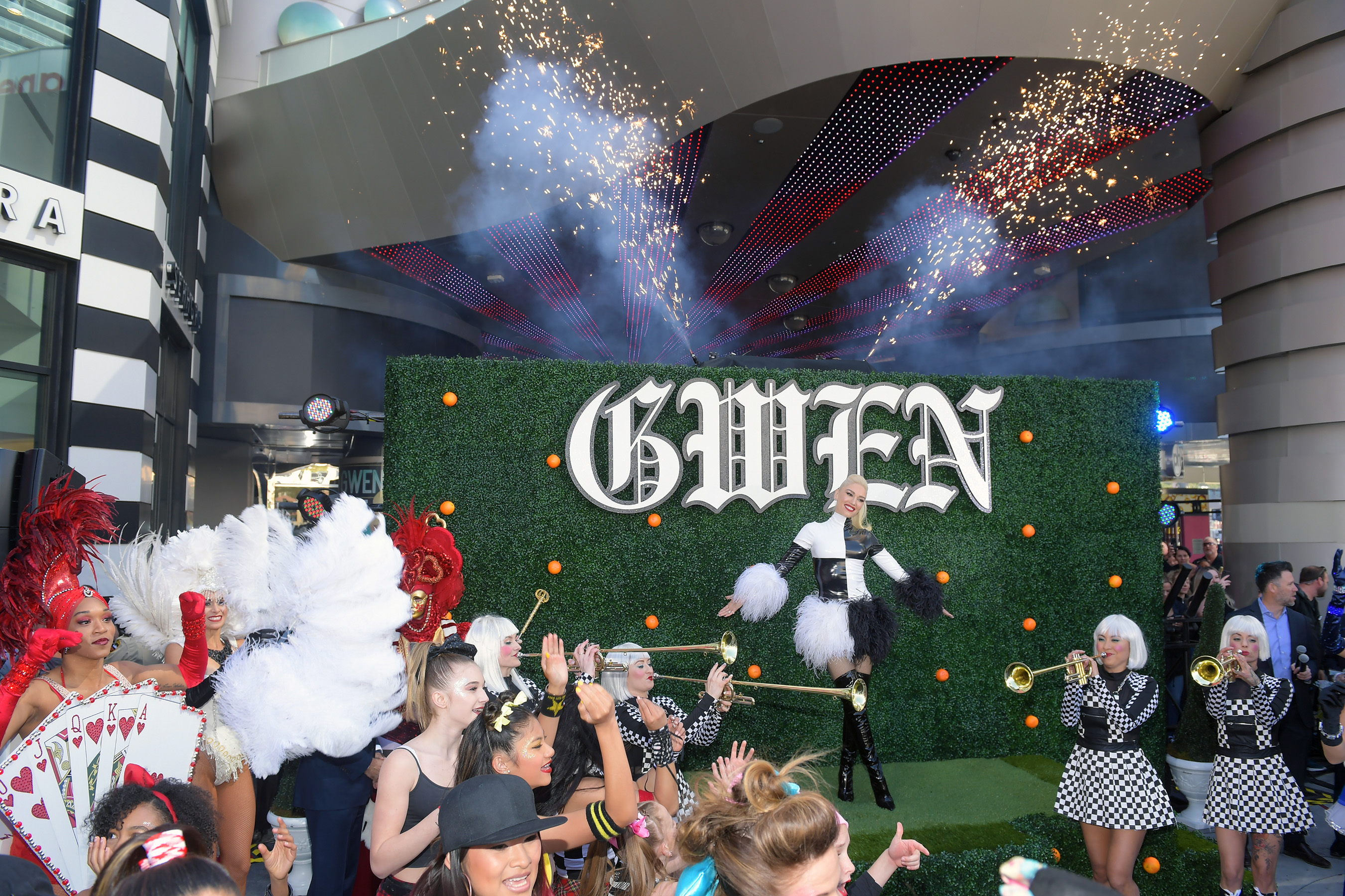 Minutes in to the dance medley, the crowd’s attention turned toward The Strip, where a full-size semi-truck made its way down Las Vegas Boulevard. The truck, wrapped in “Gwen Stefani – Just A Girl” show art, drew gasps of delight from fans who were treated to a colorful daytime pyrotechnic show. Stopping in front of Planet Hollywood, the truck halted traffic along The Strip, allowing the dance performance to spill out into the street. Another group of dancers emerged from the truck, as showgirls lined the truck’s staircase in feathers. To the surprise of the crowd, as the showgirls pulled their fans back Stefani stood at the top of the stairs to reveal her grand entrance as more fireworks set off. Making her way up the steps to the property, Stefani stopped to greet fans and sign autographs as her most iconic hits, including “Sweet Escape” and “Hollaback Girl,” played overhead.