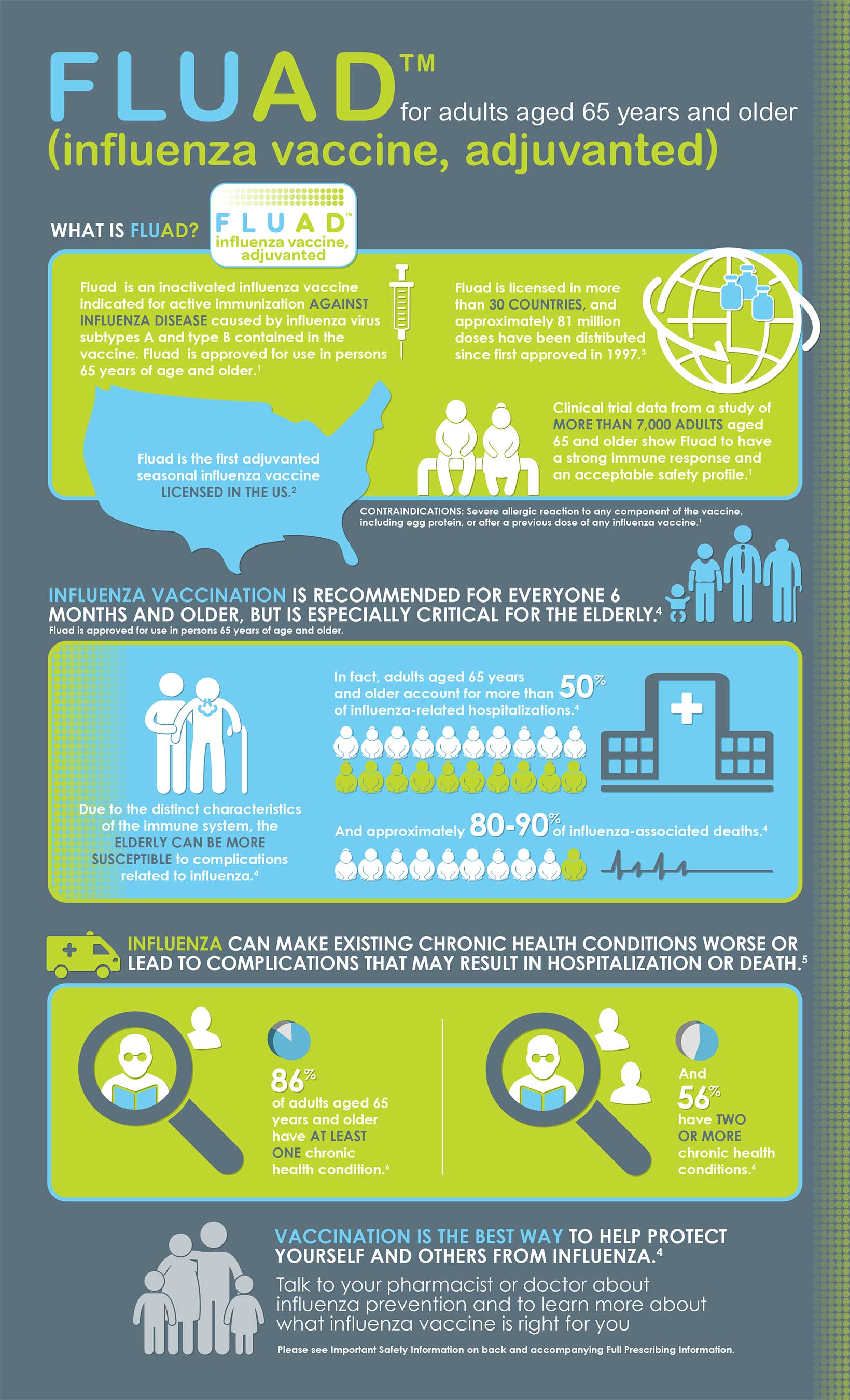 FLUAD is an inactivated influenza vaccine indicated for active immunization against influenza disease caused by influenza virus subtypes A and type B contained in the vaccine. FLUAD is approved for use in persons 65 years of age and older.2
