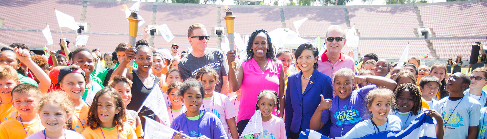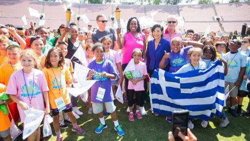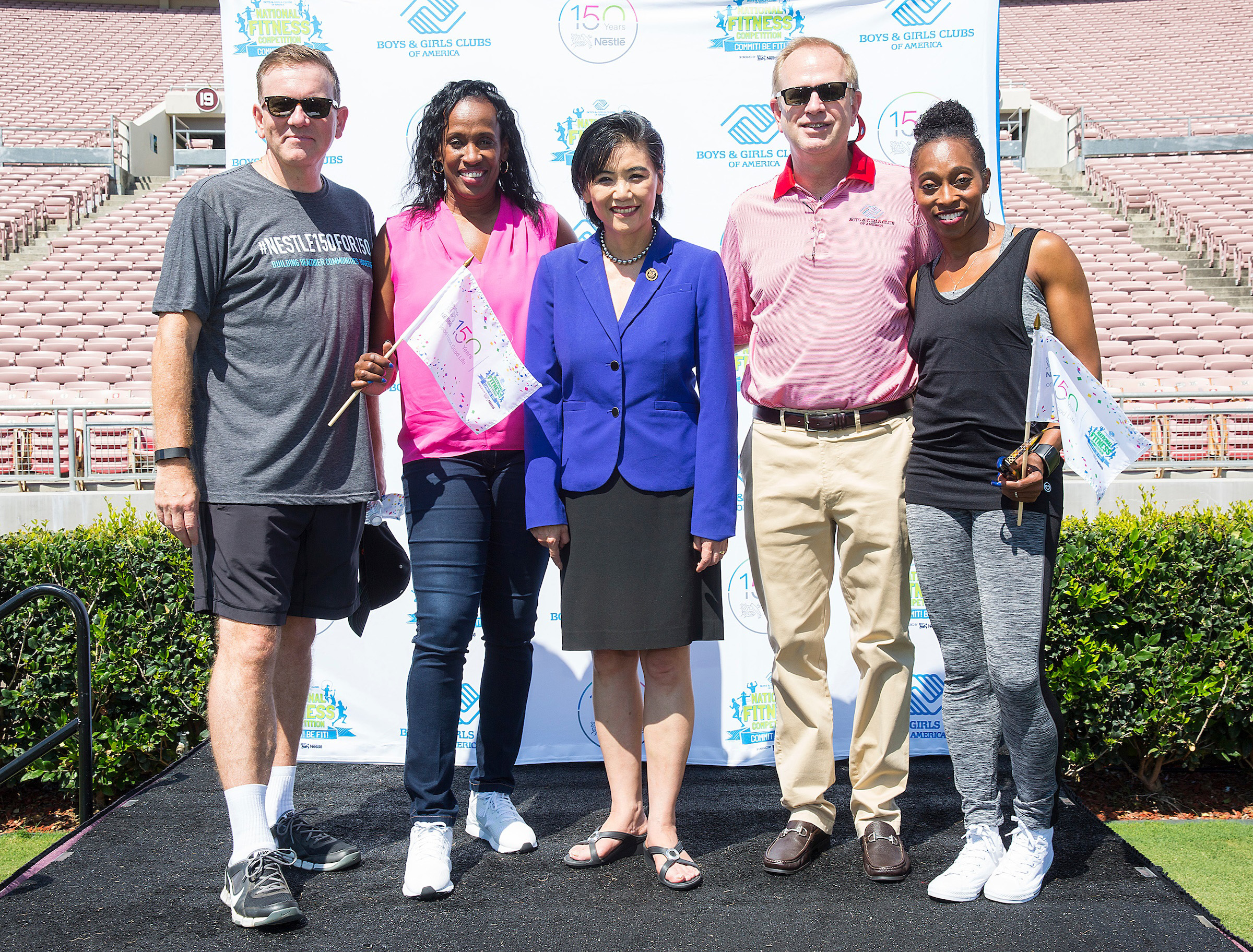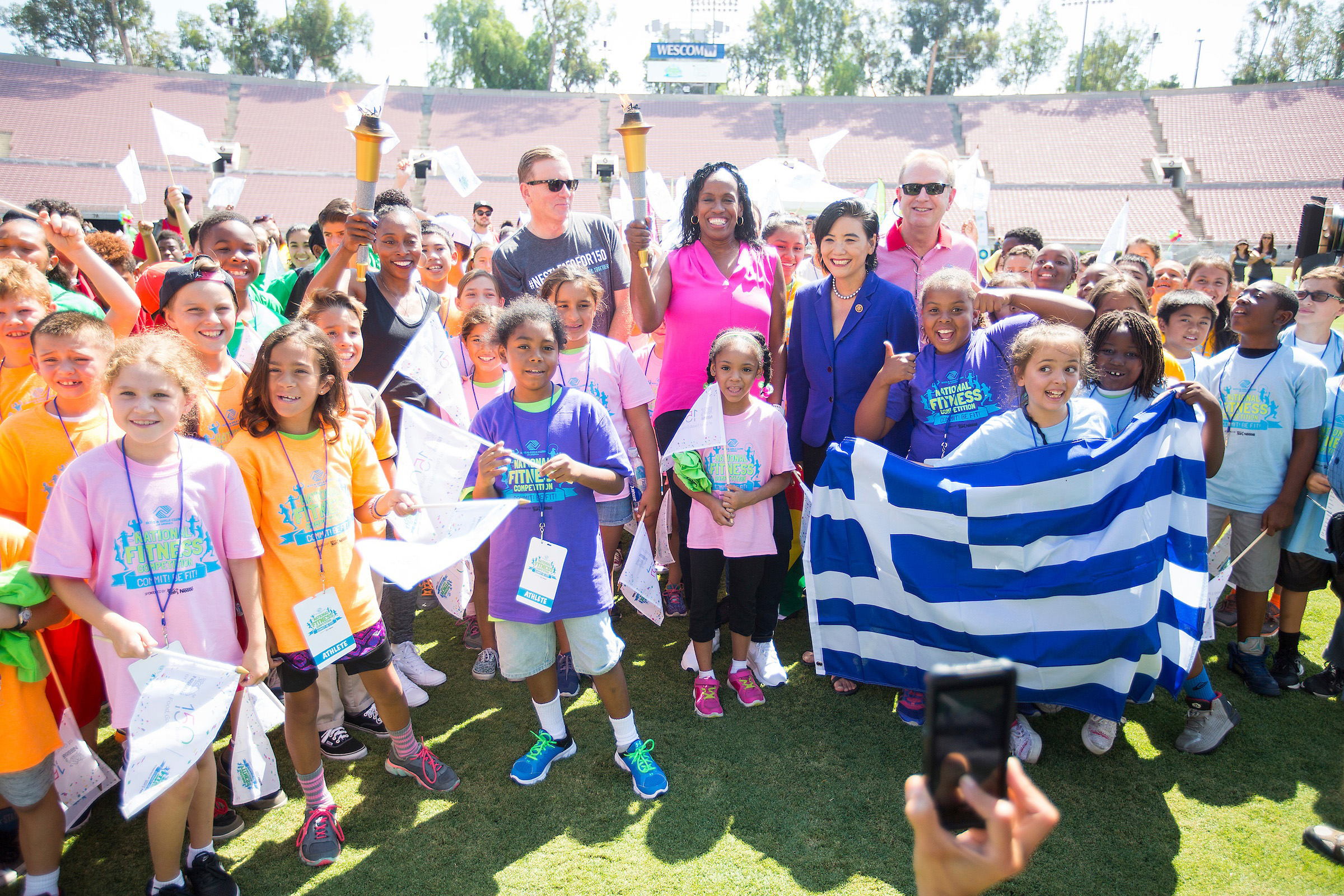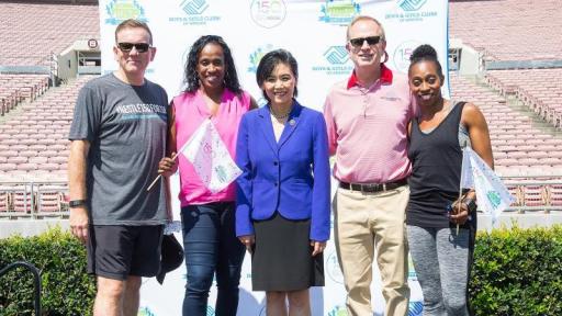 On August 4th, the Rose Bowl Stadium roared as more than 200 area youth gathered for the National Fitness Competition’s “Gold Medal Games.” Additionally, more than 300 Clubs and tens of thousands of kids and teens participated in National Fitness Competition events around the country. Hosted by Boys & Girls Clubs of America and Nestlé, the National Fitness Competition is designed to inspire kids and teens to achieve tangible and short-term fitness goals. Track and Field Olympic Champions and Club alumna, Jackie Joyner-Kersee and longtime supporter, Gail Devers added to the excitement of the event by joining the festivities and sharing their fitness journeys. Through their stories, Joyner-Kersee and Devers inspired the crowd to stay focused on their goals and never give up on their dreams. From soccer to archery the two Olympians joined the youth in the event’s physical activities and challenges.