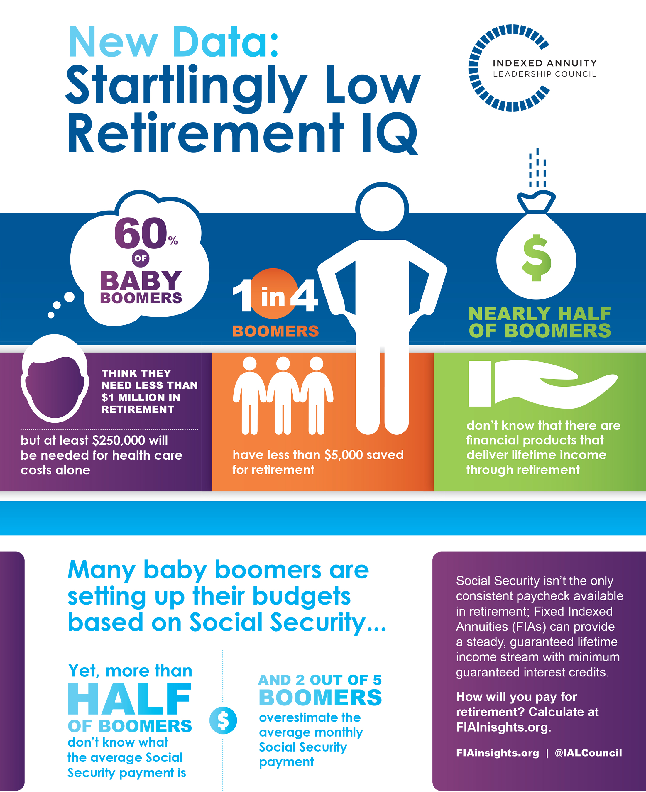 Although many Americans think they are financially savvy, new data shows how the group closest to retirement, baby boomers, struggles with retirement fundamentals and is not saving enough for their golden years. New data released by the Indexed Annuity Leadership Council shows that many baby boomers aren’t financially prepared for retirement – they have little saved, are consumed about lifetime income options, and don’t know how much money they need to live comfortably.